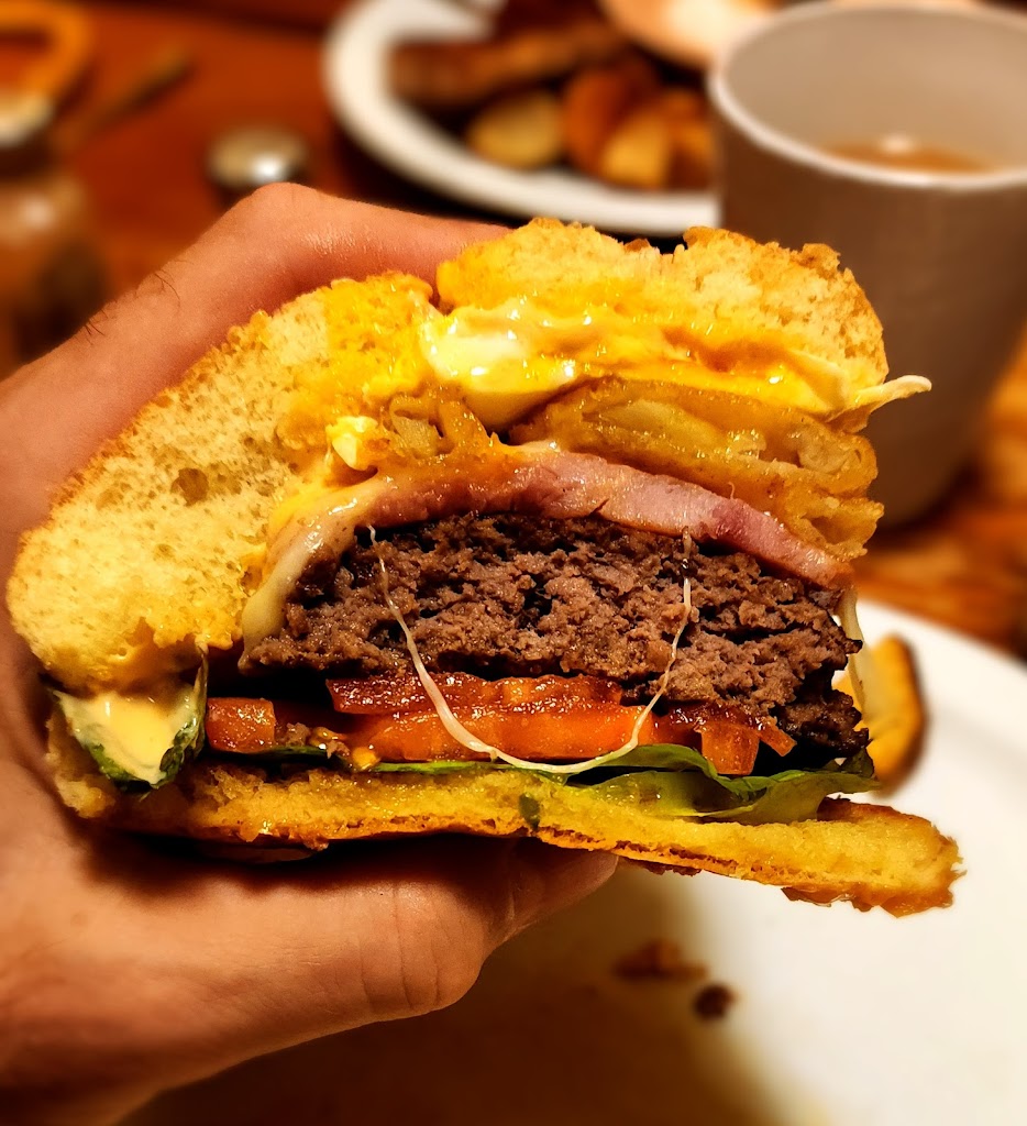 Best breakfast burger ever...Egg, smoked ham, onion ring, 1000 island, lettuce, tomato all on top a delicious burger...waitress said to cut in half and don't let go....Great advice 😋