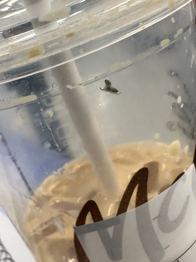 About half way through drinking my iced coffee, noticed a dead bug stuck to the inside of my cup. Looks like a fruit fly on steroids. Absolutely gross. Excellent service every time I go here but that’s nasty.