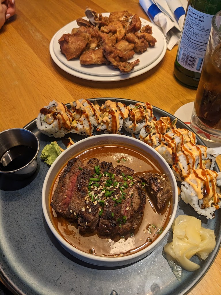Good food, highly recommend the steak and sushi. Located just past the security gates in fort McMurray airport, it's super accessible. There is a large variety of choice on the menu and refillable drinks. Servers were friendly. Unfortunately the service we could severely overworked without any two of them in the hole restaurants very hard to get their attention