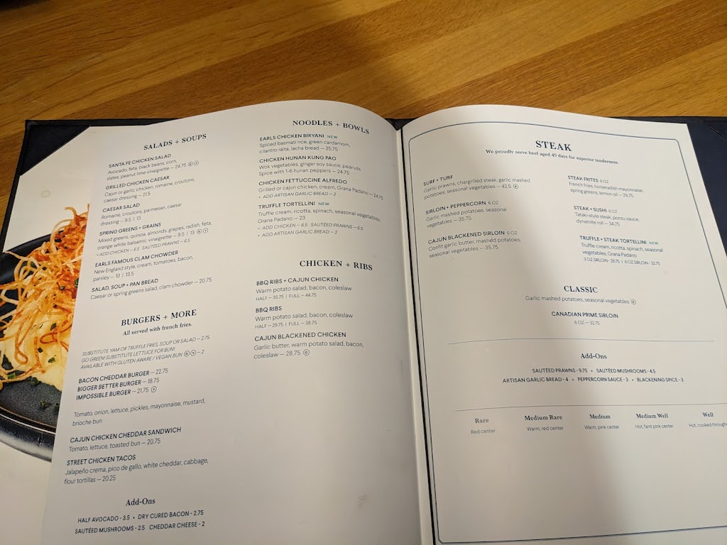 Absolutely horrible service by Maddison. I was a server before so I don t like to complain and empathize on how difficult it can be to work with the general public but I cannot accept this. I ve taken clients to Earls for many years but am almost debating changing it up. I had to track down the waitress after waiting for 20min to order. When she did come, she apologized and said she was busy - there was 5 people in the restaurant and then she sat down for half the time I was there. I ordered the Steak Frites- she asked me if I was okay with dynamite rolls really??. When I said it comes with fries she said she didn t know. I also had to get up and tell her the temp I wanted it because she didn t ask. On top of that, I wondered why it was so spicy, especially when it comes with garlic confit. There was a $3.00 charge for blackening spice which I did not ask for. When I asked her about it, she said that is how it comes and the $3.00 is the cost for seasoning. I ve ordered this before and NO, that is not how it comes. If I wanted blackened, maybe (still a stretch) But I didnt, and I don t think it s fair to charge an additional 3.00 for something I didn t want on an already $30 steak. She was very condescending and I had to politely argue with her which goes against everything I stand for doing at a restaurant, this was just incompetent behavior and a lack of common sense. To add to it, there were a few other mistakes that I didn t even bring up because it wasn t worth it but I m regretting not saying something now. Extremely frustrating, I simply told her these things and was met with combative answers, excuses and a complete lack of ownership. That is not what I consider a pleasant dining experience and can expect better service at a 2 star restaurant let alone this one.