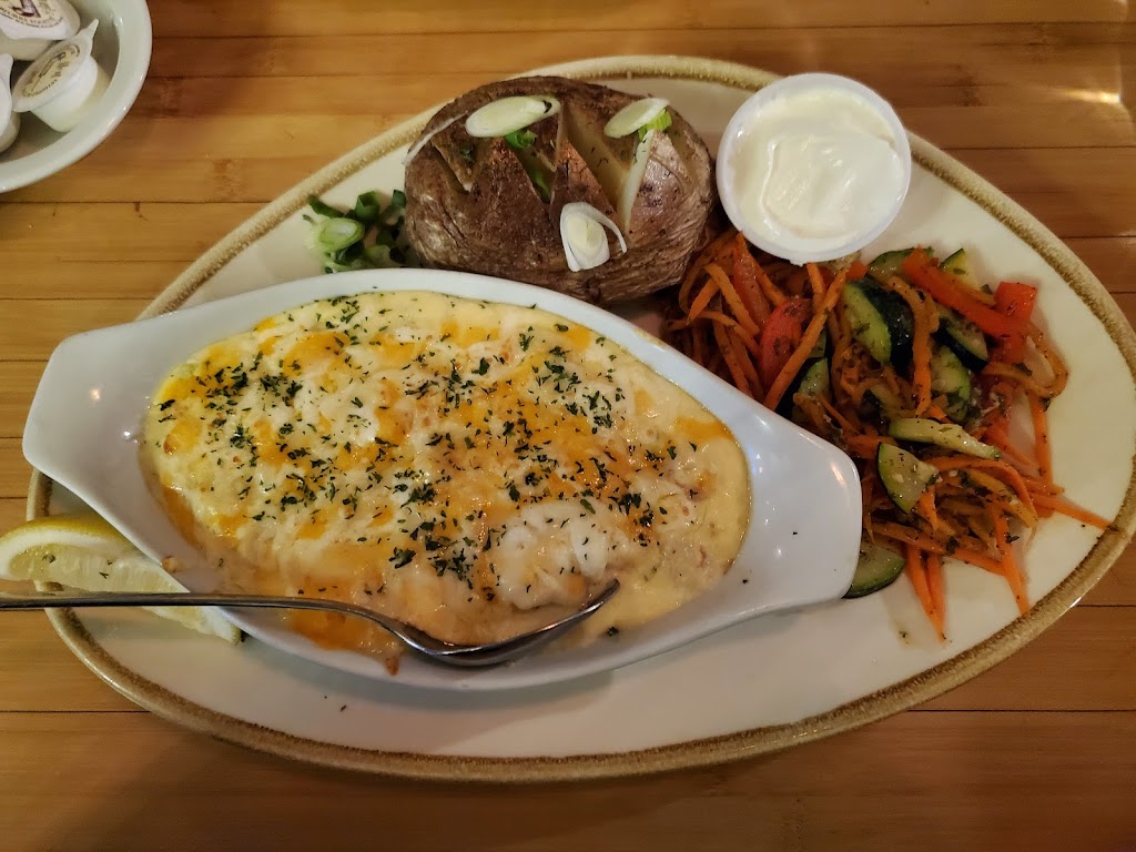 My husband and I had lunch, and he had seafood casserole (he highly recommends it) I had chicken ceasar salad (very good). The service was great.