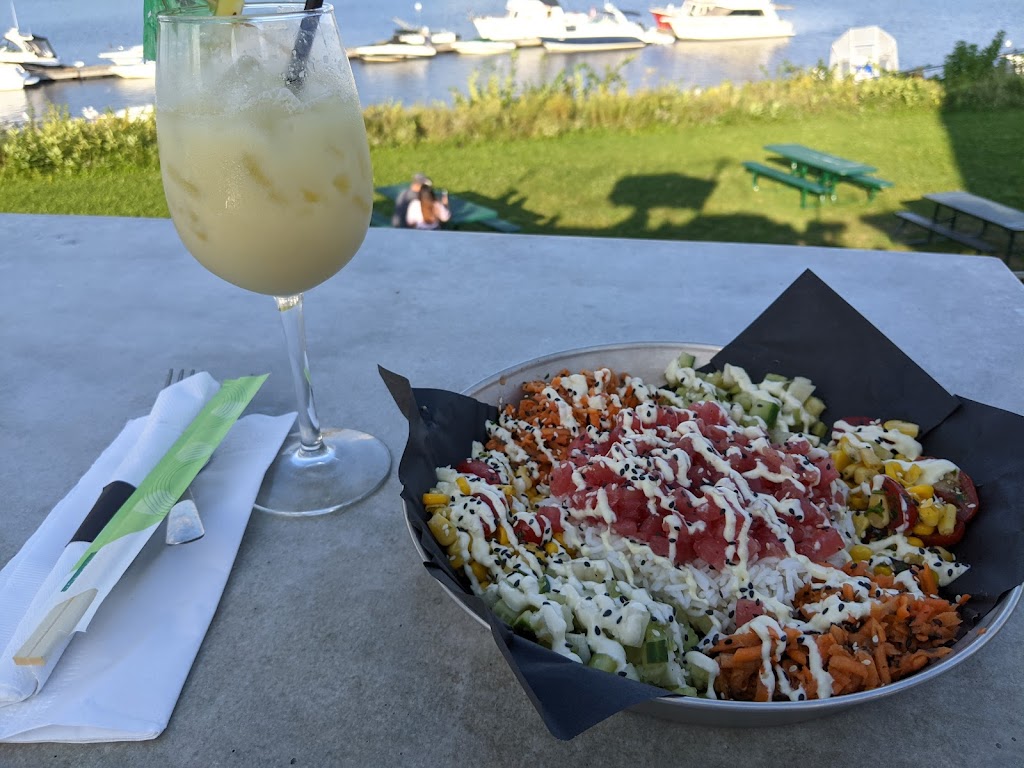 Only selling feature is the location. Drinks were good but very expensive. Food was very meh. Our server was super nice but it was slowwww. Took over 45 mins after ordering for her to come back and say bad news theyre out of lobster rolls. We were in Fredericton for 2 days and lobster was on the list of have to have so was bummed, she brought us free chips and cheese which were very blah and waited at least another 30+ mins for our next order of food. The poke bowl was supposed to have edamame and avocado.. no edamame and dollop of guac instead