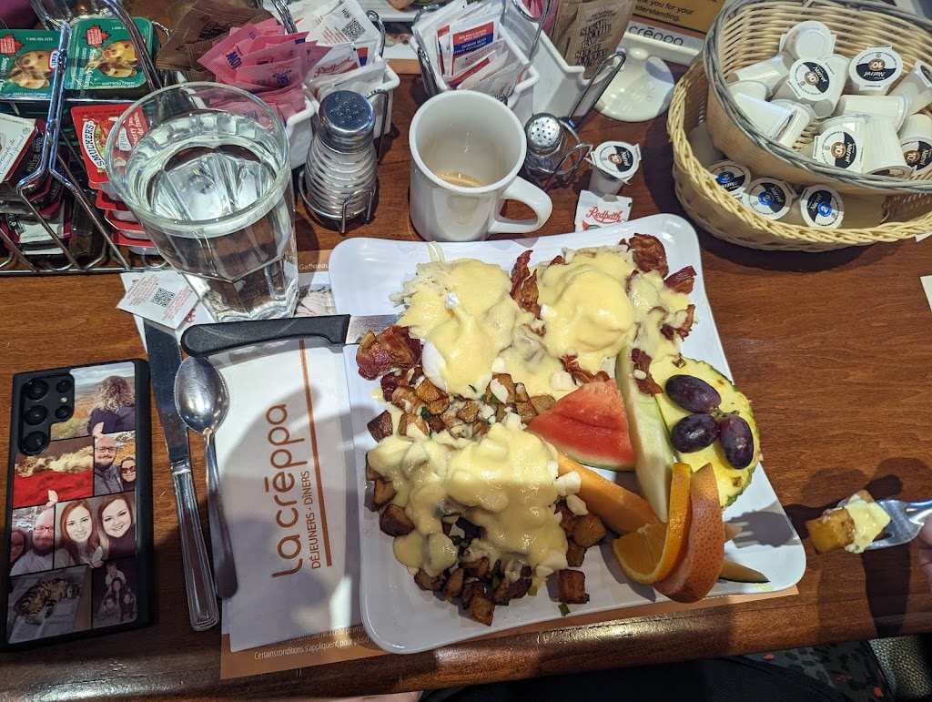The La Créppa restaurant is a spacious family establishment. Although we called to reserve on a Saturday, we found upon arrival that there were plenty of tables available as the space is large. As soon as we entered, we were warmly welcomed with a radiant smile. The plates are comforting. I opted for the eggs benedict with Brie and coconut. Although it is not haute cuisine, I really enjoyed my dish. It should be noted that all the fruits were fresh and delicious. The servers were very friendly and friendly! The service was quick, whether for the coffee, taking the order or receiving our plates. In short, La Créppa is a charming family restaurant that I warmly recommend
