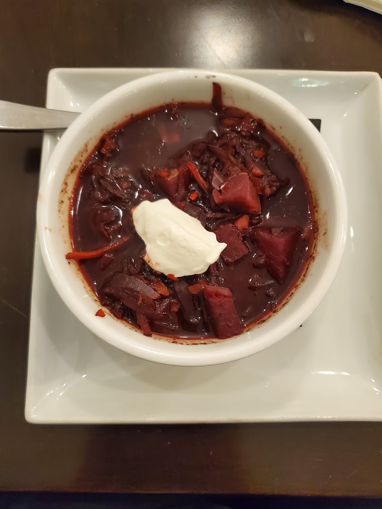 Our first visit was on a Friday night and they were swamped, almost all the tables were full. We started with two orders of bruschetta, since we didn't want to fight over it lol, and I had to try a small bowl of the borscht. Both we absolutely amazing...this is the best bruschetta in town (with the office coming in second). The main course was decent but we couldn't finish from the very filling appetizers. Couldn't find the room for dessert...will definitely have to try it out next time, we will be returning soon!! This restaurant is T approved