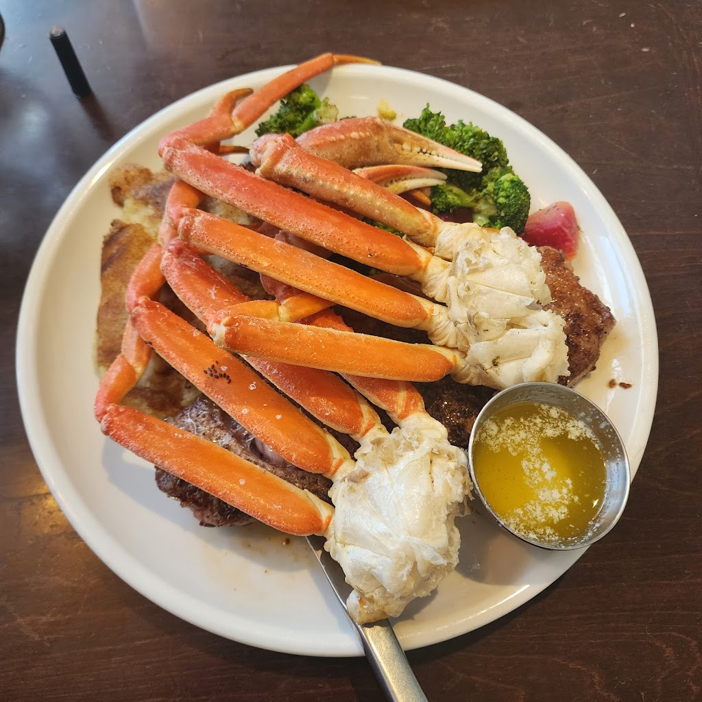 Oh my god. I left this place stuffed. All you can eat crab with a steak! First off, we mistakenly ordered appetizers. We had clam chowder, PEI mussels, and the mushroom soup. The mussels were incredible. The others with me said the soups were to die for. They sure looked and smelled delicious. I ordered the crab with 4 oz steak. With my meal came melted butter, and when I asked for lemon, it was brought quickly. The only downside is that the butter cooled too quickly. They definitely need the butter warmers. My crab was perfectly cooked, delicious, and salty. Exquisite! I ate 3 helpings of the crab and left the restaurant completely satisfied and waddling. 😳 My meal also came with veggies and potatoes, but I don't eat either. Two of my dinner mates said they were excellent. The others ordered the 12 oz new York steak and the seafood linguini. Every one of us was extremely happy with the quality of the food and the portions. Excellent service, too! What a meal!