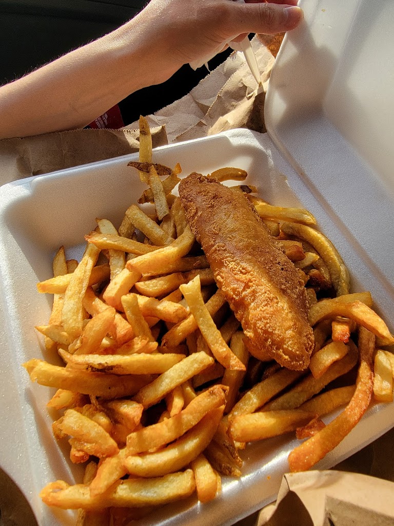 Food was good prices good picnic tables and umbrellas parking available and restrooms available. Friendly local chip stand!