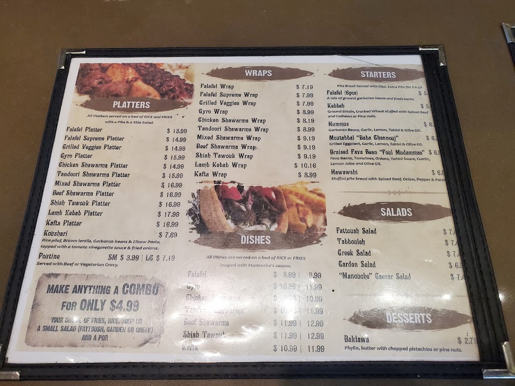 My son says Really good fries We cancelled a march break trip last minute because he was so sick in the morning. When he woke up at 11 am, he spent the next 5 hours talking about wanting fries from manouche to make up for missing his first trip to the US. Food : 5/5 |