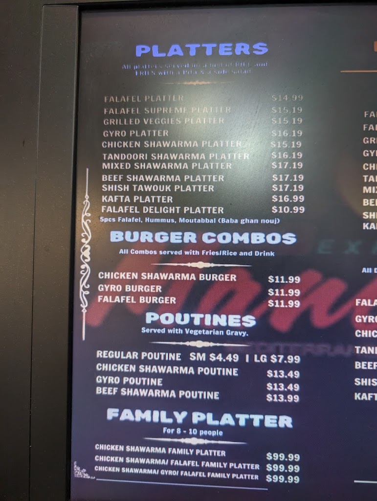 Good value for money food. We bought plate and shawarma sandwich. Unlike other places, food was prepared with care. Definitely now our go to place for shawarmas in guelph!