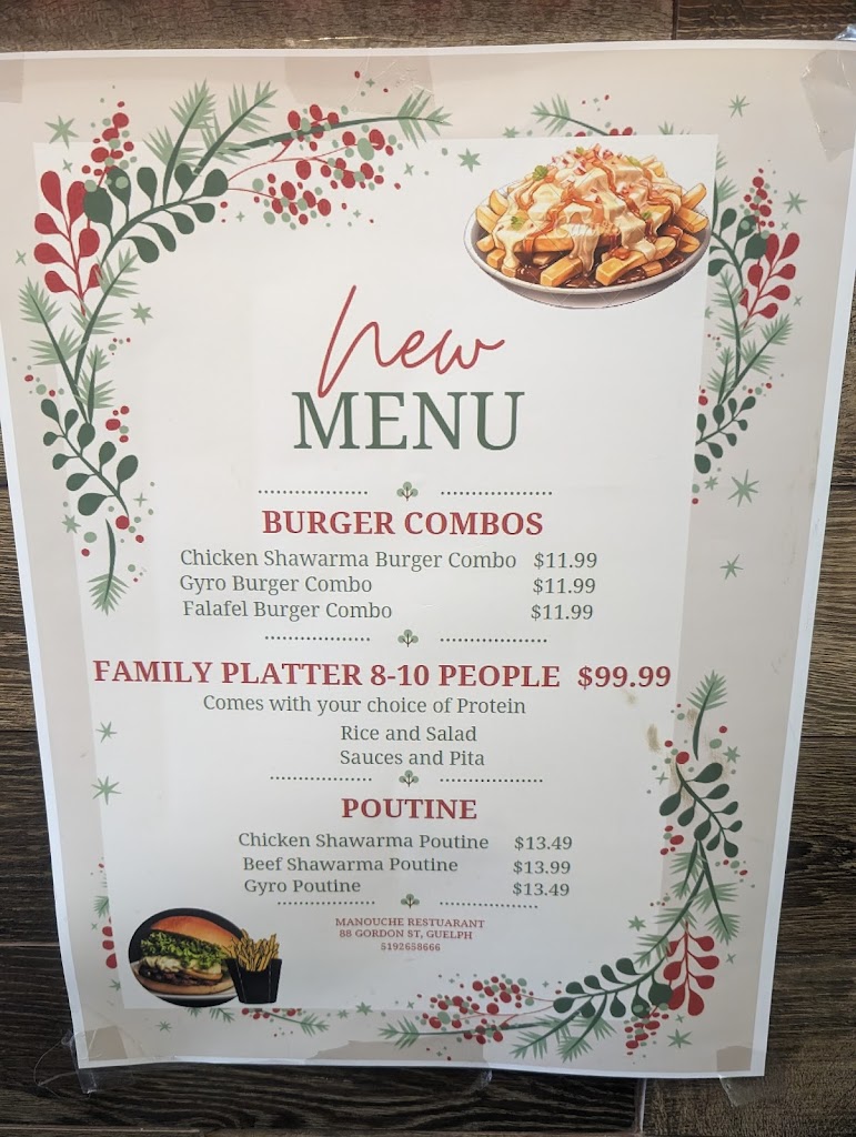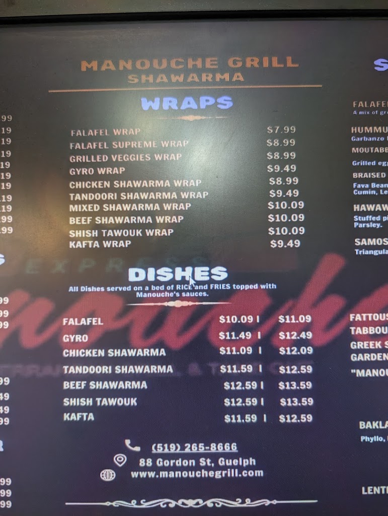I love their shawarma sauce. It is good and similar to Osmow's. Students of the University of Guelph also get good value deals at this food place. I didn't see the half fries and half rice chicken shawarma option available in their menu, but good thing the person serving our food was kind enough to accommodate that configuration. The place is small and there is not a lot seating available to dine in. We situated ourselves by the lone table with 2 seats near the door. By the time we were finishing up our meal, I did appreciate the person over the counter being kind enough to check up with us and ask how the food was.