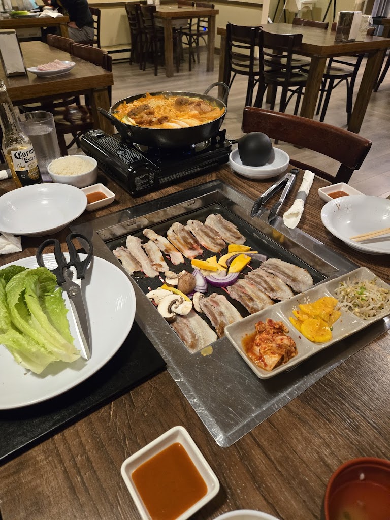 Food is yummy here! They have a large menu of items to pick from and a good selection of drinks. The complimentary side dishes, miso soup and rice that comes with meals is great. I really enjoyed the tteokbokki ramyun here😋 service is really good and all of the waiters are kind. When you order meats the waiters cook it for you!
