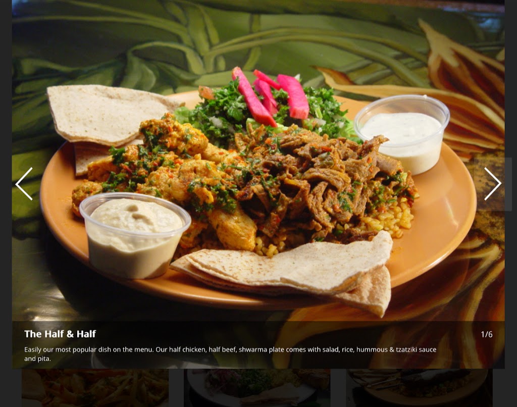 Delicious Middle Eastern cuisine. The Half And Half with chicken and beef on a bed of rice along with a side salad, hummus and pitas bread, tajiki sauce is our staple go to meal there. Add a few falafels and grape wrapped dolmas you wont be disappointed. Cash only. See you there!
