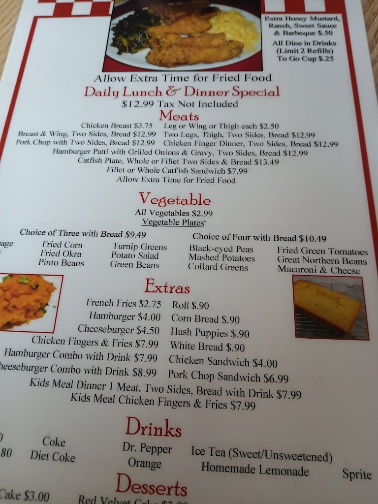 Wonderful friendly service. The food is right out of Grandmas kitchen every time. My whole family lives everything they serve but that catfish and fried chicken is something to talk about