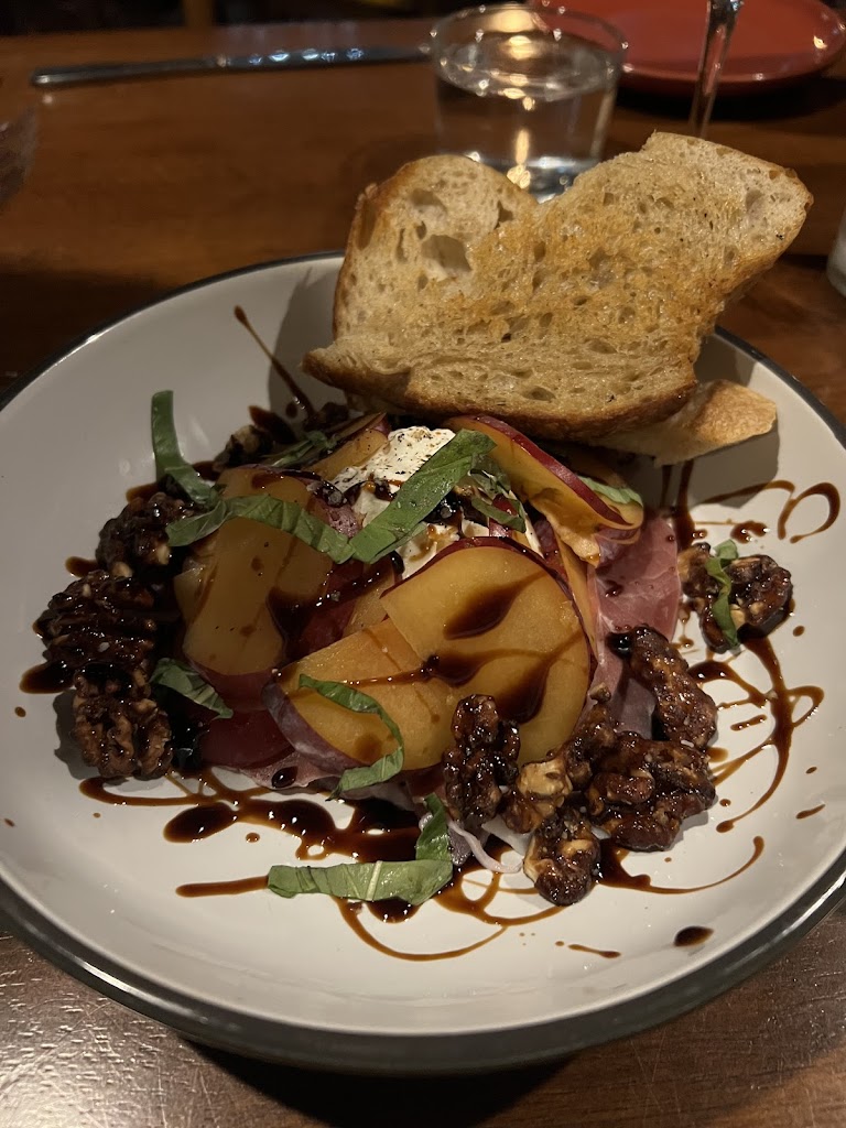 The dining was spectacular. We ordered one of the cheese boards and added two extras. We couldnt eat it all. We tried. So good. Then the wait person told us about the available desserts. We shared a peach puree goat cheese cheesecake. OMG. Who knew your taste buds could do a happy dance?