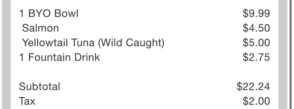 Food was good but very pricey for what I got. The build your own poke bowl didnt come with a protein at the base price. So to add ahi or salmon was $4.50 upgrade