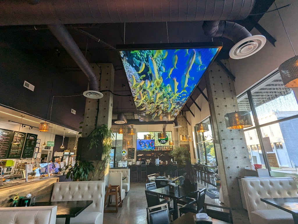 First time trying this spot! You have an option of mainly poke bowl, ramen, and sushi... you can sit at the sushi bar or table while also just quickly ordering a poke bowl for those quick Togo lunches. The energy was top notch walking in! Happy faces Ended up sitting at the sushi bar. Started w a roll, and I felt like as soon as my order left my mouth, it was landing on the table. QUICK service, and it was beautifully garnished. Next, sheared salmon and shrimp poke bowl.. salmon was a bit dry, but the caramelized avocado was a nice balance. Would get it again. I think this would be a fantastic lunch spot go to. Next time Im in the area I plan on visiting again! Great food and amazing service. plus I enjoyed the not so typical decor...including a huge video wall on the ceiling.