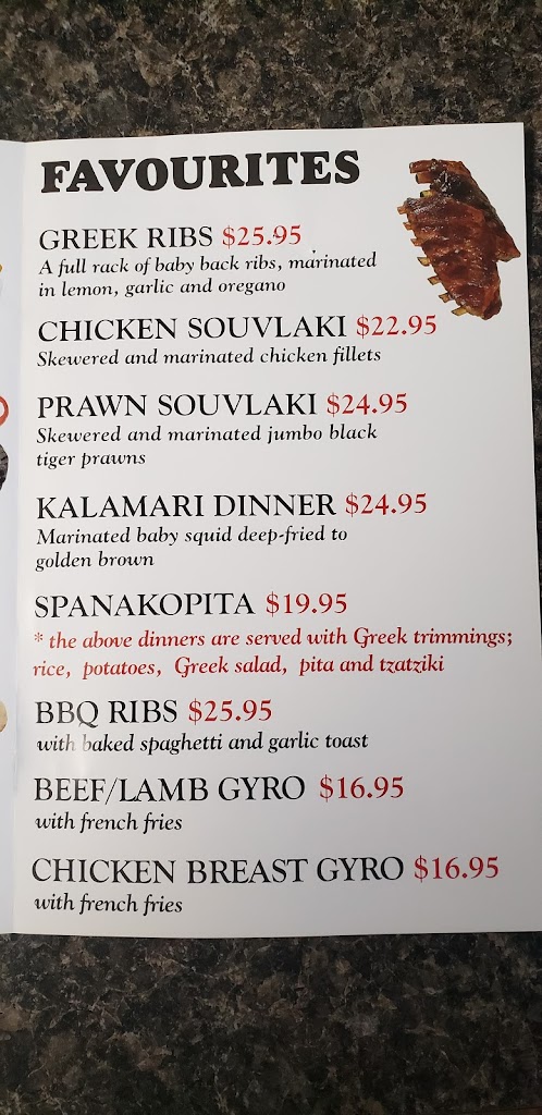Takeout traditional Greek food: such as can, Mediterranean chicken, and Greek ribs. Meals come with rice, lemon potatoes, and tzatziki. Limited soda options, the nearby Shoppers and SaveOn can solve this small shortcoming. Typical wait times are 20 to 30 minutes, but could vary based on size of order and how busy they are.