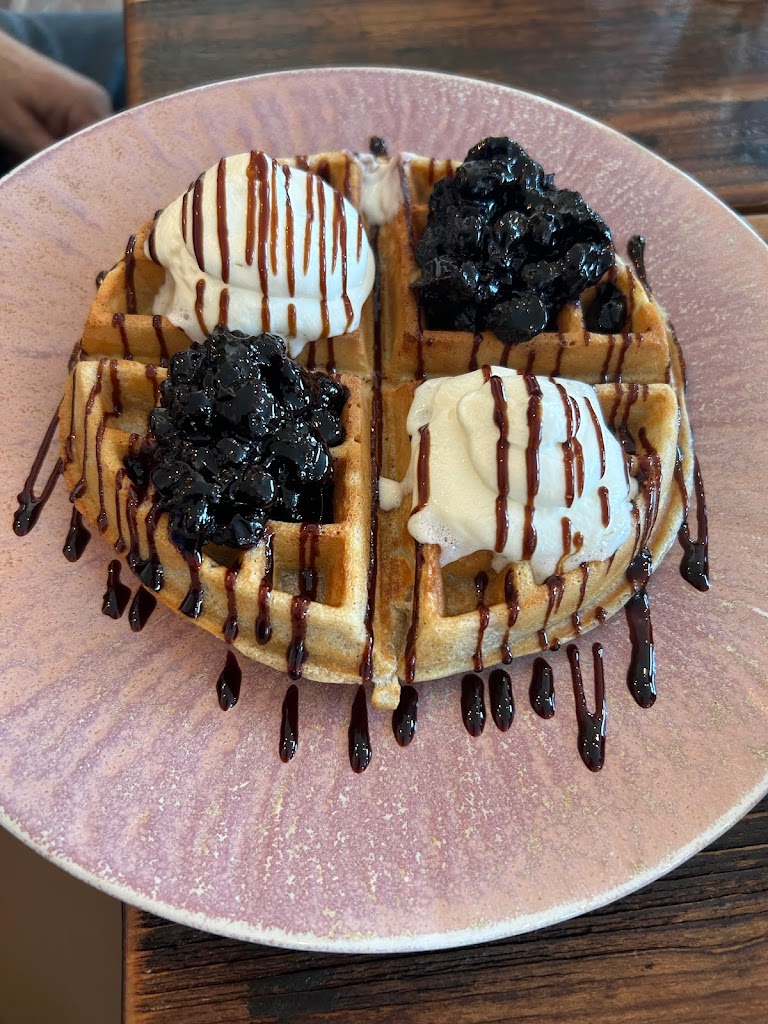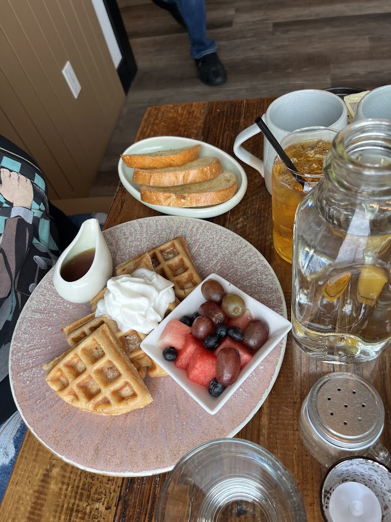 I had the traditional eggs, bacon, hash browns and toast. It was delicious. We always look for restaurants that serve farm to table and this did not disappoint. They have a large waffle menu that goes beyond your regular waffles. My husband had the blueberry waffles with the balsamic reduction and they were delicious. We each ordered an espresso drink that was one of the best we’ve had on this trip. Our waiter, Waleed, was the best; personable ,efficient, and very attentive. A great breakfast experience. Highly recommend