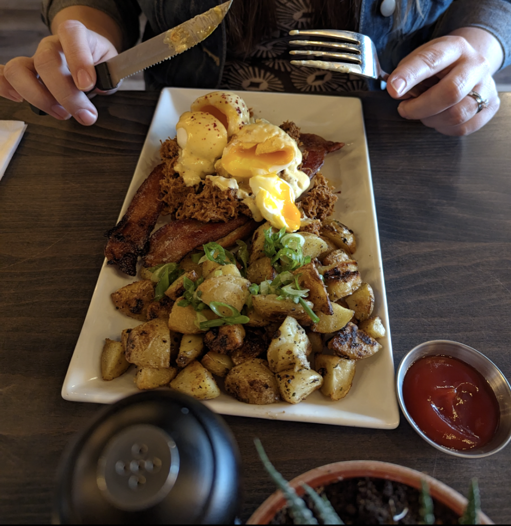 Honest review, love the restaurant itself, nice layout, good atmosphere, good service. The menu is lacking a bit for a breakfast place, they should have a traditional eggs, meat, hash browns/toast item. Call it what you will but everyone loves a standard breakfast. I had the breakfast poutine... 2/5 would not order again, they served it in a small cast iron pan, which I love, but the pan itself was room temperature so my breakfast was cold, the only thing that was warm was the eggs which were good but the poutine only comes with one egg I had to order and pay for a second egg. The pulled pork was good and tasty but cold, the hash browns were okay, but again cold, the hollandaise sauce wasnt great, kind of bland maybe it would have been better if it was warm. I will go again, but I definitely will expect more from the kitchen.