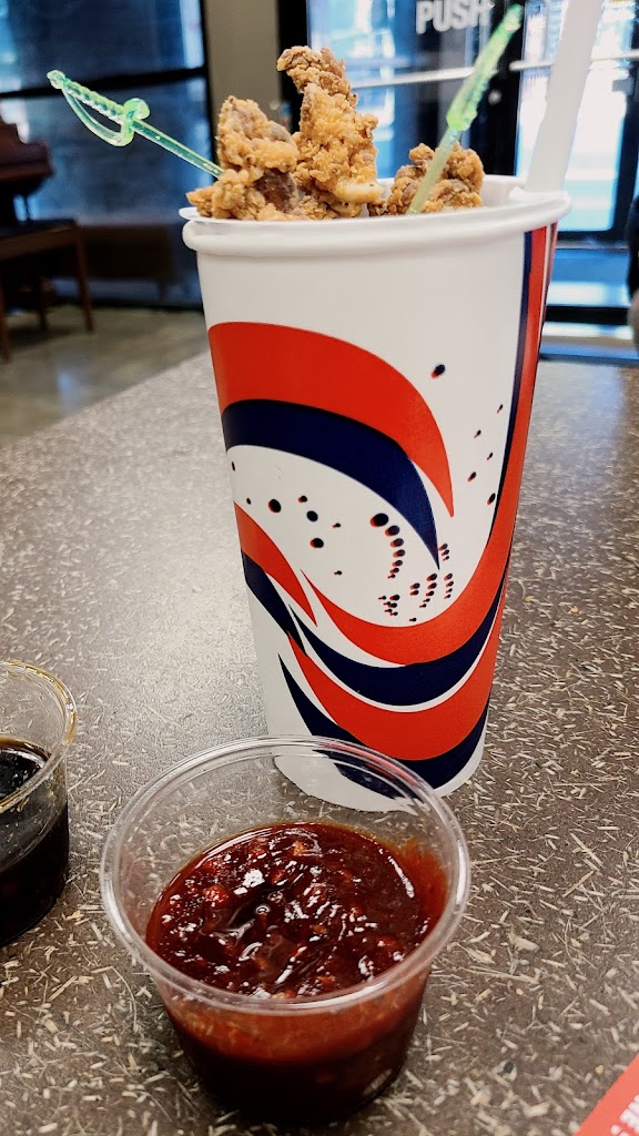 Pretty hidden since it was stationed inside of a food court but server was polite and made sure my partner and Is order was correct. Food court was dingy but clean. We only tried the chicken but my partner opted for an additional fried corn dog as she always wanted to try one. Chicken was nice and juicy and the sauces complimented greatly. Although the prices were exorbitant, the chicken itself is much closer to real Korean fried chicken than most Korean fried chicken around northern BC. Still wouldnt say its worth it. The corn dog on the other hand was a massive disappointment. It was huge which left an initially good impression on us but after biting into it, my partner found out that the actual hot dog inside was only around an inch long and dry. Over half of the inside was hollow and the thing costed nearly 10 dollars. The surrounding batter was okay but definitely a slap in the face for deep fried corn dog lovers. Overall the food was not worth it for the crazy prices. The chicken almost saved it but $13/$14 for 5 pieces and a handful of fries is laughable.
