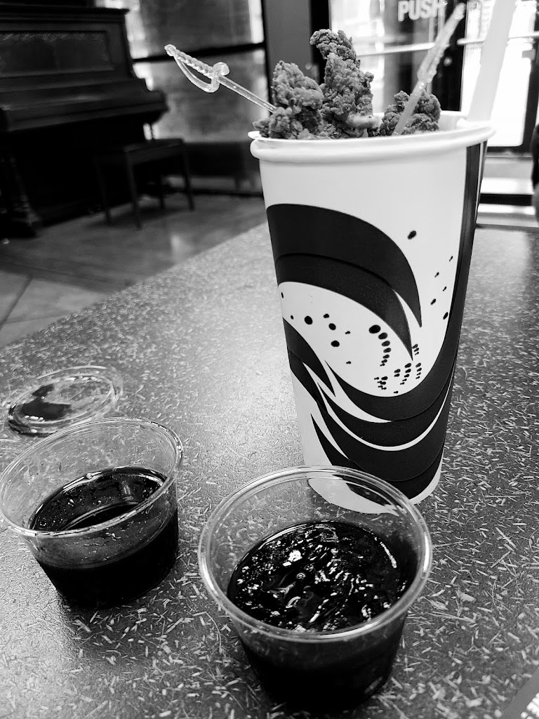 Wow! This chicken is by far the best chicken I have ever tasted. Its crispy and very tasty! It doesnt feel greasy or flakey when you bite into it, its like light and fluffy..Very yummy! Definitely! Going downtown, more often! This is a go to place for lunch or bring it home for dinner..The portion size is large.. So bring your appetites...