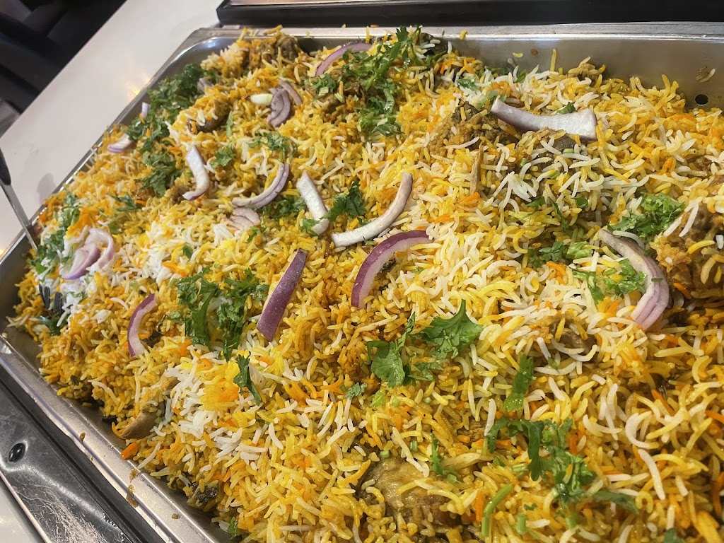 The food is delicious and fresh. There are lots of sides served. Biryani is the best!!! Staff is so friendly. Almost everything was perfect but the movie going on wasn’t okay, we brought our kids, and it wasn’t appropriate for them.