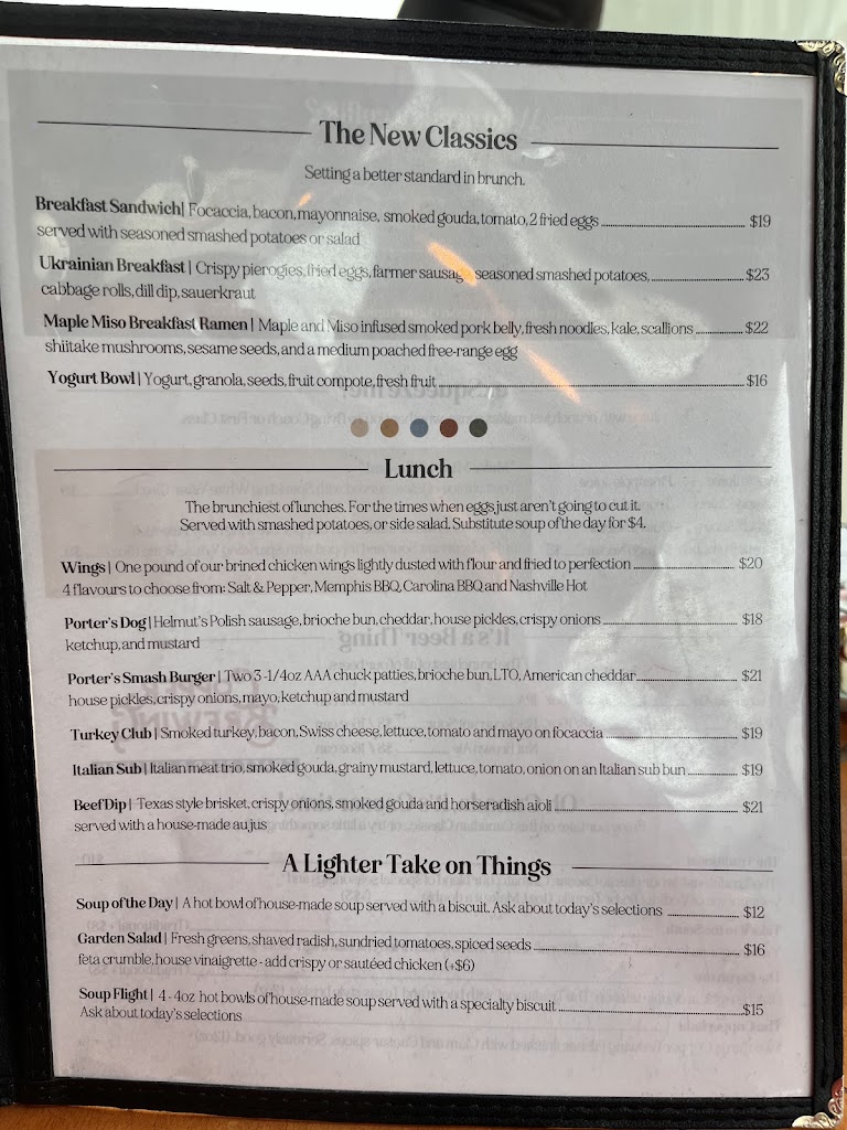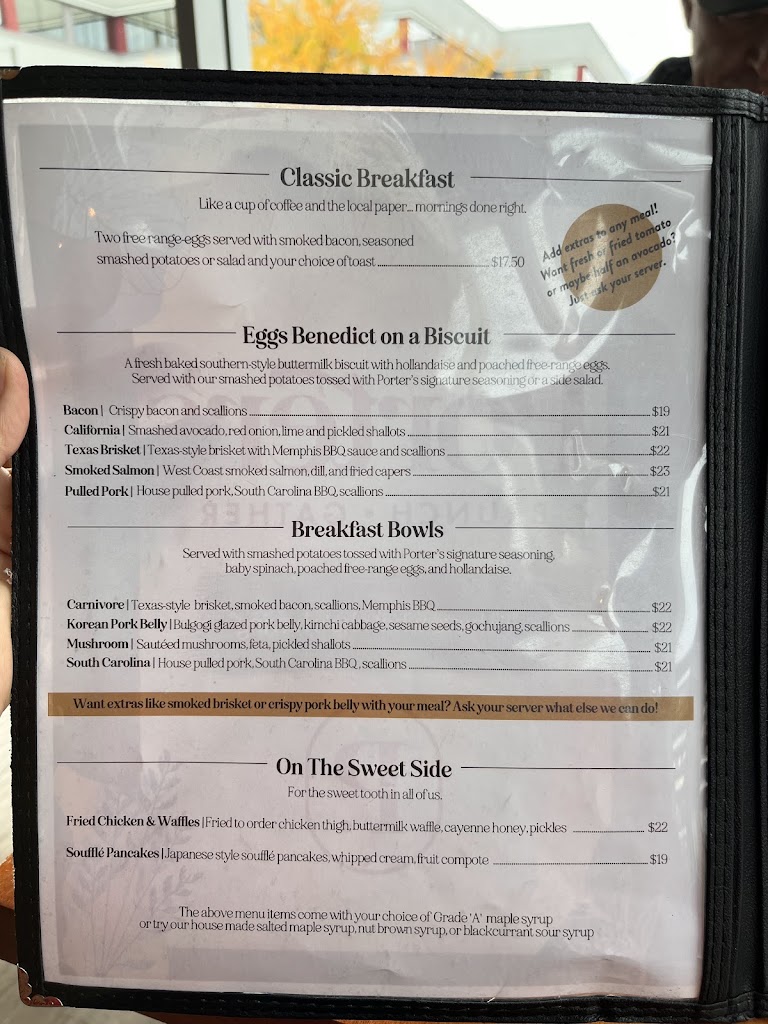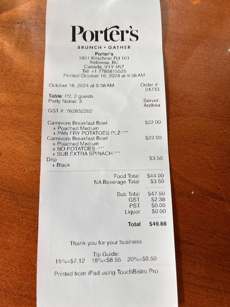 Huge rave to Porters! Amazing chef designed menu, Texas brisket FREE RANGE eggs Benny on house made buttermilk buiscits with smashed potatoes. Should have taken a picture as the presentation on all plates were beautiful. Very reasonable prices, comparable to breakfast chains which is crazy for the fact that everything is home made with quality ingredients. Favorite breakfast spot in Kelowna now hands down and with fantastic service!