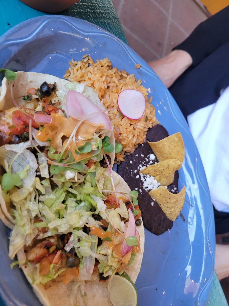 The patio is beautifully themed and has enough cover from the heat to be enjoyable. We ordered the vegetarian burrito grande and it was so delicious. It hit the spot after a disappointing weekend of sub-par, over-priced food at other restaurants. The servers were Vegetarian options: Lots of vegetarian options. Each item can be made vegetarian i.e. tacos, burritos, enchilada s, etc
