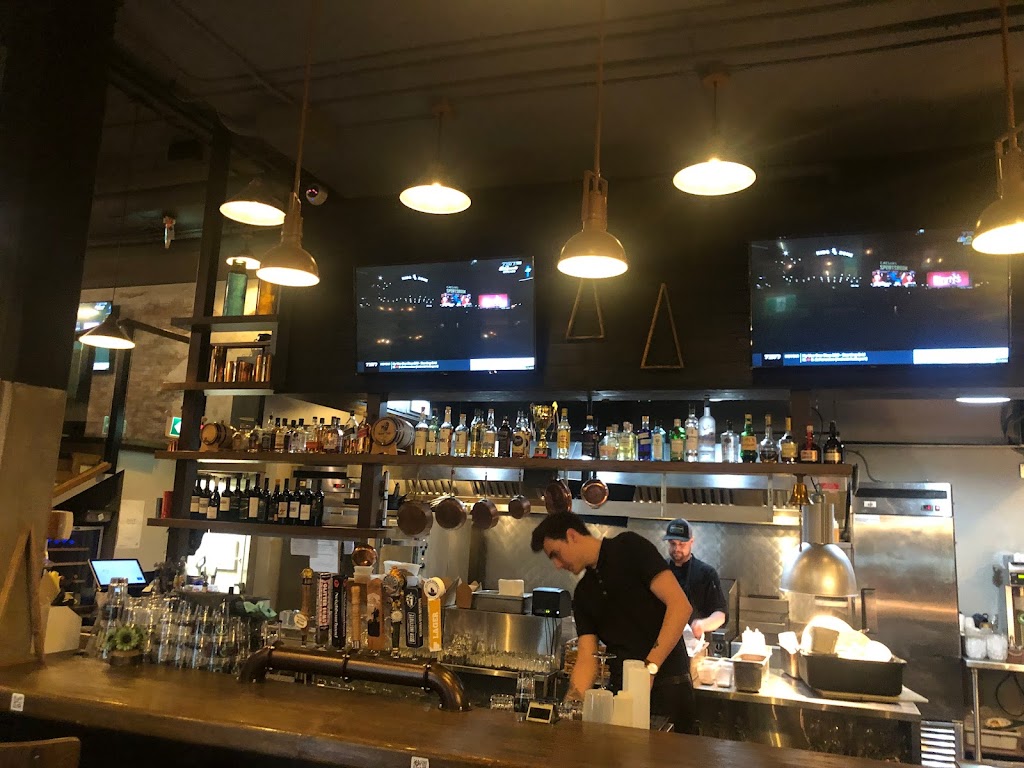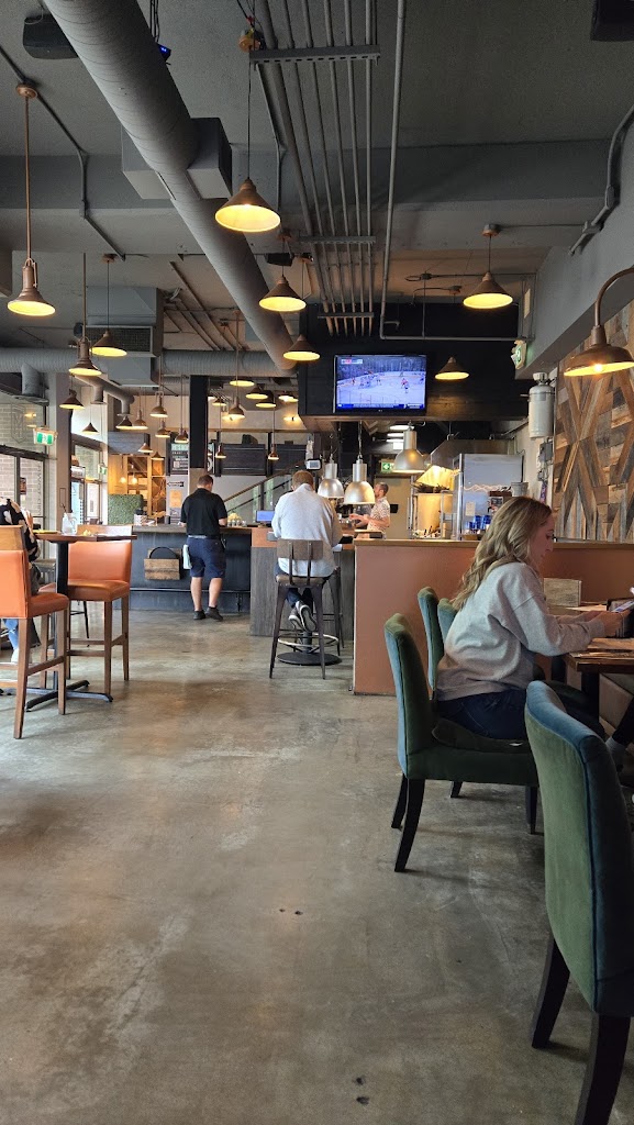 Cool atmosphere, great food and drinks. Exceptional bar & wait staff. Lots of room for bigger groups. I like the open view kitchen, nothing better then being able to watch the cooks do their thing. Great place to throw back a few cold ones and watch a hockey game or whatever. Wednesday trivia night was fun and kept the place buzzing. Lots of Happy hour and daily specials, I had the Bourbon Express, it was delicious I highly recommend.