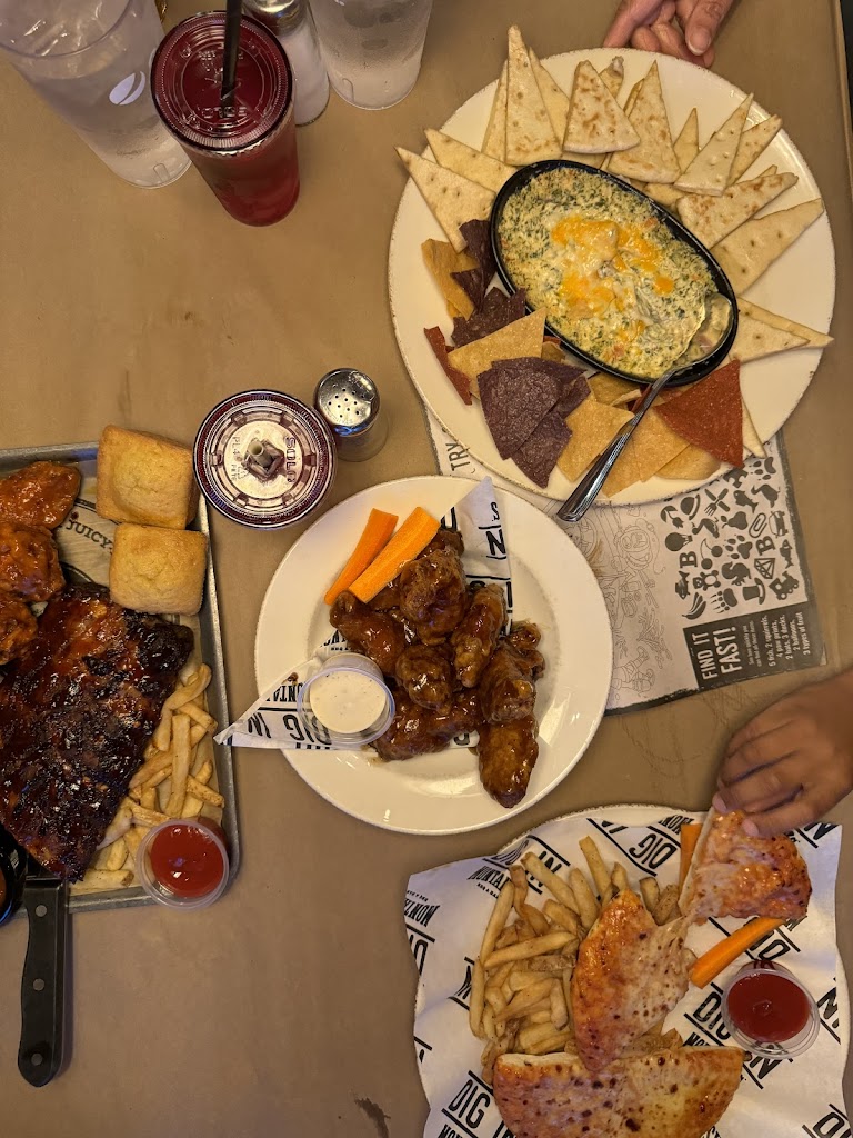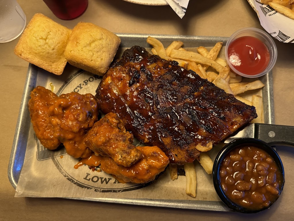 Great service from the waitstaff. We shared the large order of ribs and wings and fries with sides of cornbread and beans. Portion size easily fed the two of us. Price was around $35. Noted that the waiter and the hostess both said upon leaving, thanks so much for coming and please do come back . Wheelchair accessibility: Level entrance