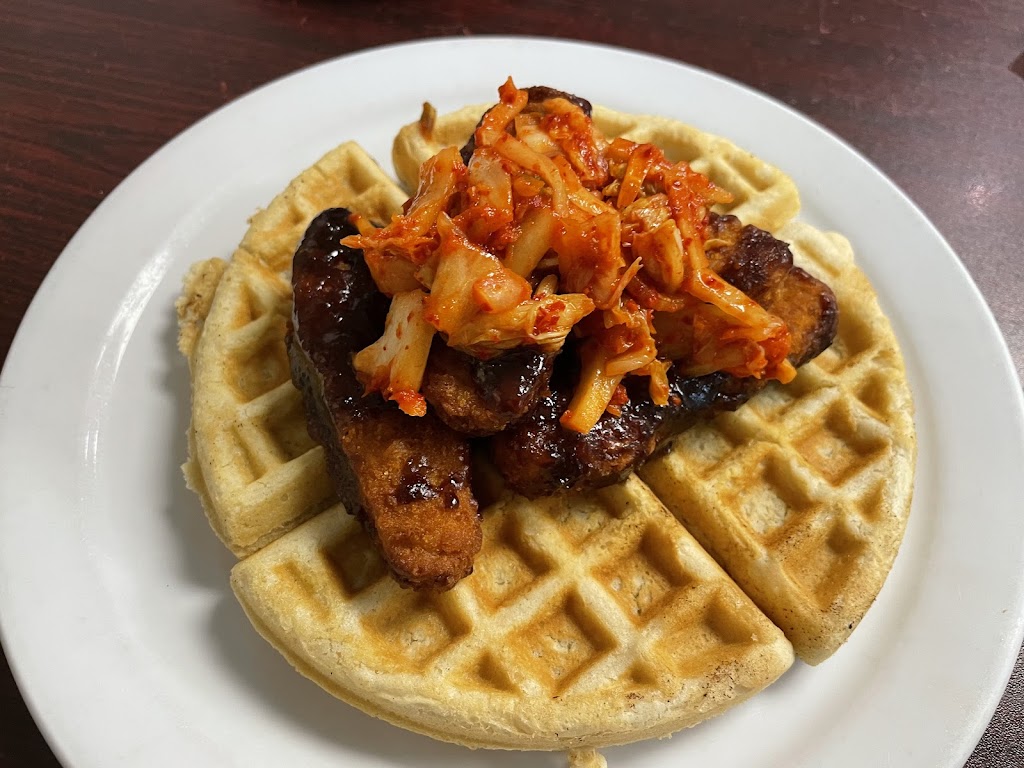 Tried the Chicken & Waffle: Seoul style. Chicken had a perfect crisp on the outside and juicy on the inside. It was tossed in a Korean bbq sauce and topped with kimchi. The waffle was soft and fluffy. The sweetness from the maple syrup was a perfect ratio. Unfortunately I didn t get to try their cinnamon buns because they were sold out. But I did get to have a double choc chip cookie and it was great! Soft and delicious!
