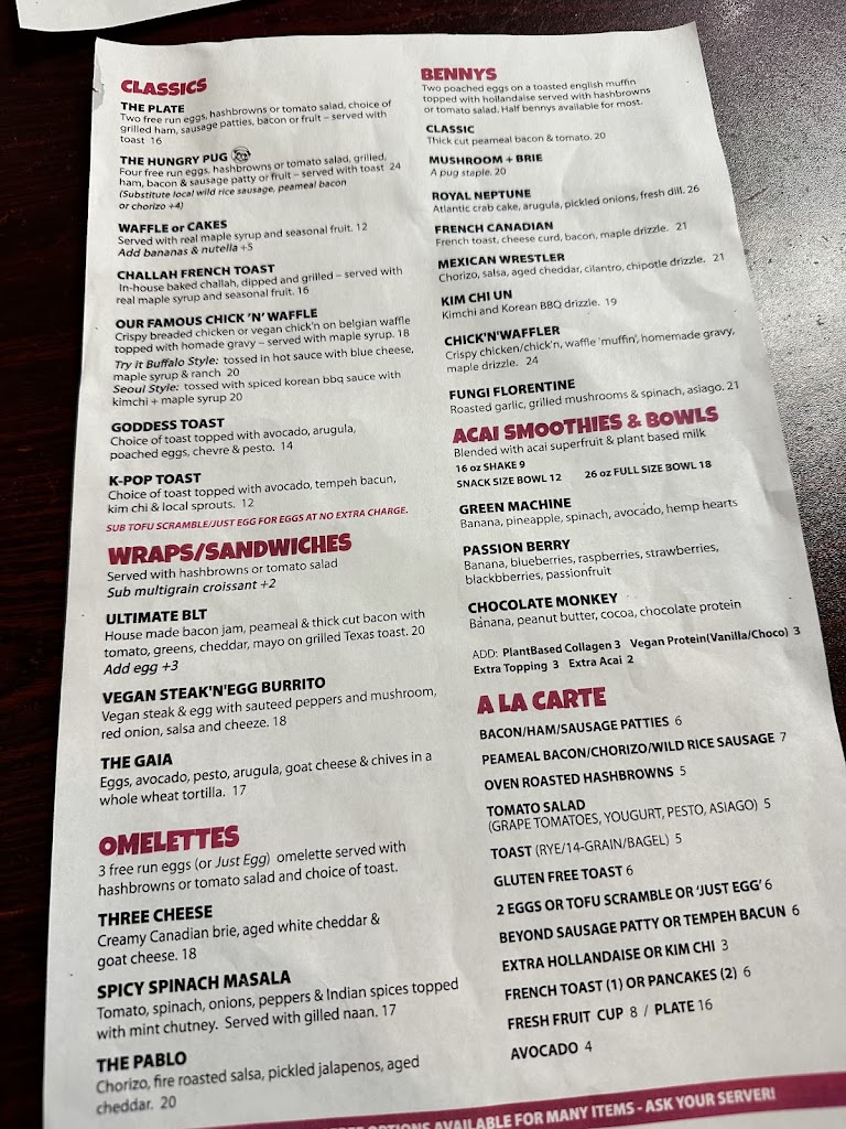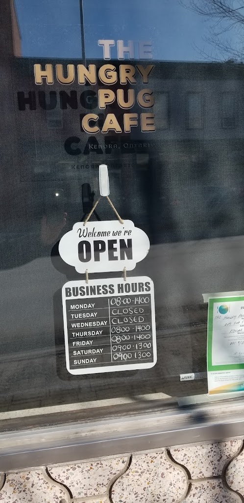 The Hungry Pug is one of my favorite breakfast restaurants, and well worth a visit! Street parking only (and plug the meter even on Saturdays, because the City of Kenora is greedy.) It's not really accessible as there is a step and a tight turn with two doors to get in. That being said, I have seen a person in a wheelchair getting wrangled in by a burly helper. (There used to be a indoor ramp from the hotel next door but it's now a separate entity and not an option anymore.) There are restrooms in back as well. ➡️ Update: March 10, 2023 I checked the washrooms, and they were -as expected- spotless, spacious (if you can consider a washroom spacious) and very clean. I went back out and complimented the owner on the cleanliness. There is plenty of seating both 2 seaters and 4 to 6 seater tables. Service is prompt and the meals are very tasty. I like the chicken and waffles myself but it's all great. I have to compliment the Pug on the bakery goods they offer, fresh scones, cinnamon buns and peanut butter cookies to name a few, all fresh baked. The owner is a trained bakery chef. I wanted more scones to takeout afterwards, and he made a fresh batch and baked them up while I was having breakfast! That is great Kenora service. ➡️Update March 6, had a "naked" cinnamon bun, which is my term for an non-iced bun. Delicious The Pug is closed two days a week (Tuesday , Wednesday at present) and open in the mornings, so check first. I usually look the day before at the hours posted on a sign in the window. ➡️Update, see photo attached. It's located between the old Kenricia Hotel and Dinos Greek restaurant on Second Street. Did I mention it's really worth visiting? October 6 2024 update The placard enticed me to try Turkish eggs. Well, I did and the dish was, as always, delicious. I literally wiped the plate clean. Excellent service and well worth the wait for the meal.