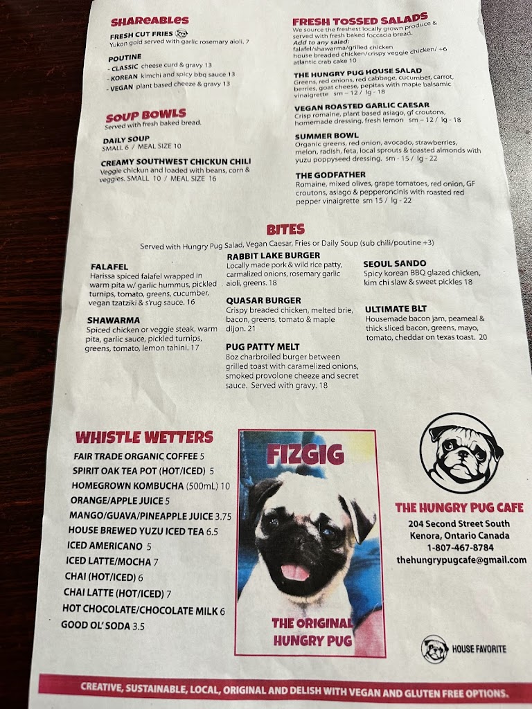 Having recently moved to Kenora, I was so pleased to find the Pug Cafe, an eatery that focused on vegan dishes as much as meat options, along with sweets that literally are all mouthwateringly delicious! The food is prepared with local fresh ingredients and I find myself being attracted to dishes where in a 2hour radius from the town, I cannot find such as their shawarma which can come as a meat or vegan option. Do yourself a favor, come by, take out, eat in, say hi to Carl and all the wonderful upbeat staff, feeling part of the community. Thank you Pug Cafe. I ll see you soon! Dietary restrictions: Great for vegans and vegetarians along with meat-a-vors! Kid-friendliness: Children have so many options to choose from in terms of eating.