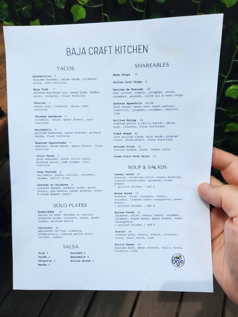 I came to Baja this week for tacos and I was pretty happy with my mean! I ordered the tuna, birria and fish tacos as well as the grilled shrimp as a starter. I like that you can order tacos by piece to try multiple flavours. The fish taco was my favourite by far! I took 1 star off because the birria taco was fairly bland, Ive had them at other restaurants where they are juicy and flavourful so I was disappointed with how this one tasted. Otherwise, food was great, service was great, the restaurant was quiet on a wedneday night. Overall, I would recommend it to anyone!