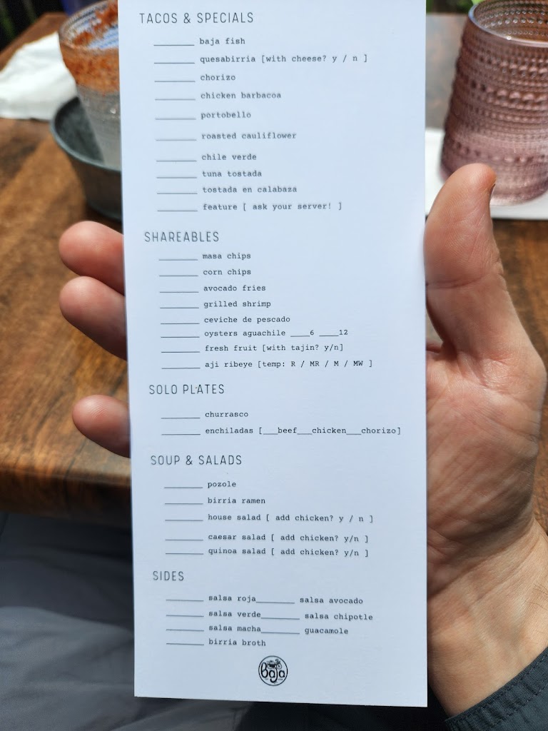 A delicious, must-try restaurant! The staff are very friendly and made great recommendations. We really the enjoyed cocktails - especially the Capilla Margarita! Our favourite tacos were the Quesabirria, Tostado en Calabeza and the Tuna Tostado. The Chilaquiles Verdes we re also great. End the meal with fruit and Tajin for a special treat!