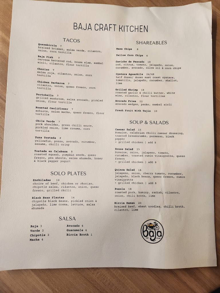 I call this the Boo Who Baja Craft Kitchen. Went there with a group of Friends, Food came out 1 at a time if it even came out. 2 hours waiting for a salad!! Talked to manager and wait staff , they used the excuse that the kitchen was very busy, but they continued to seat new customers. Gave them zero stars as nothing was good. Service was terrible, and dont know what the food tasted like because I canceled my order after waiting 2 hours for the food. Never again..Worst experience ever.