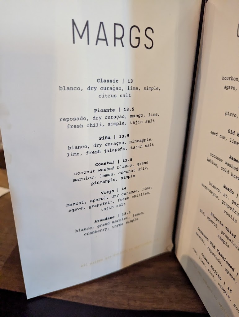 Great margarita choices (I had a coconut one), our server was very helpful with the menu since I dont eat meat. I had a cauliflower taco, mushroom taco, and shared the chips with guacamole and salsa Verde. The chips were unlike any Ive had before.. very thick and crispy with an almost soft inside. So good , will be back !