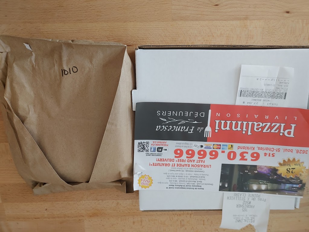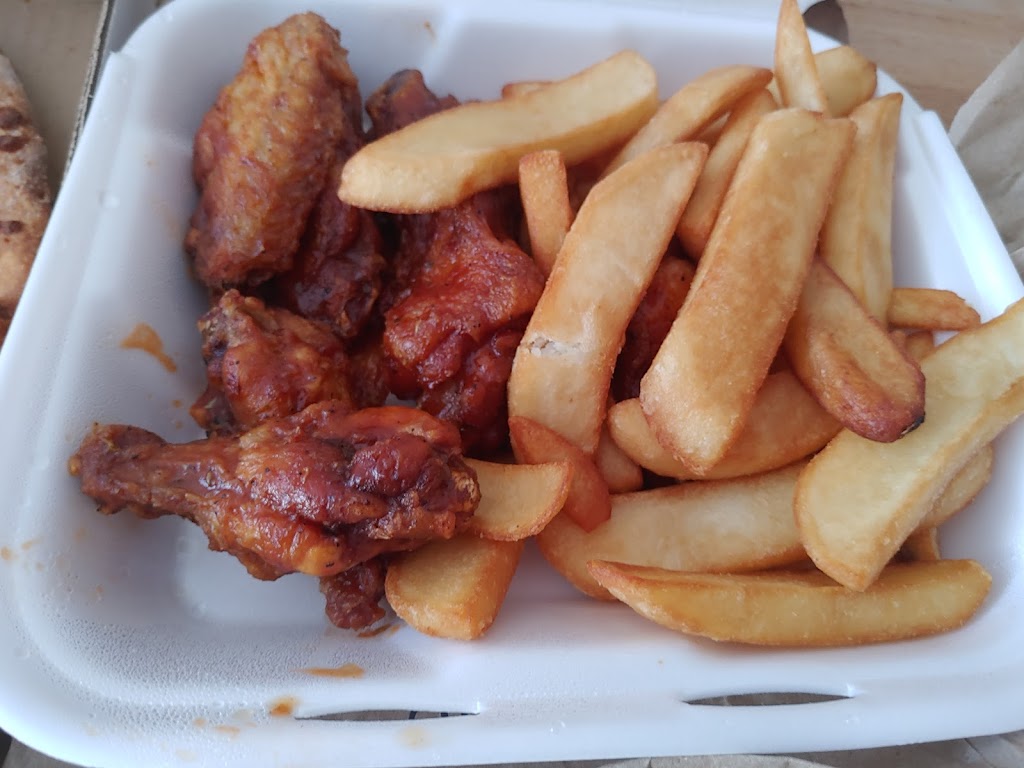 The food arrived in less than 30 minutes. The chicken wings smell amazing and tasted great. I would have been happier if the coating would have been a bit stronger in flavours but nonetheless it was still good. I especially liked the fries that came along with the wings. Crispy on the outside and soft on the inside. The toppings on the pizza is generous. However, because of that, it makes it a little bit dry for me. Still, it tastes great and cost only 13$ for a 10 inch pizza and 9.95 for 8 wings.