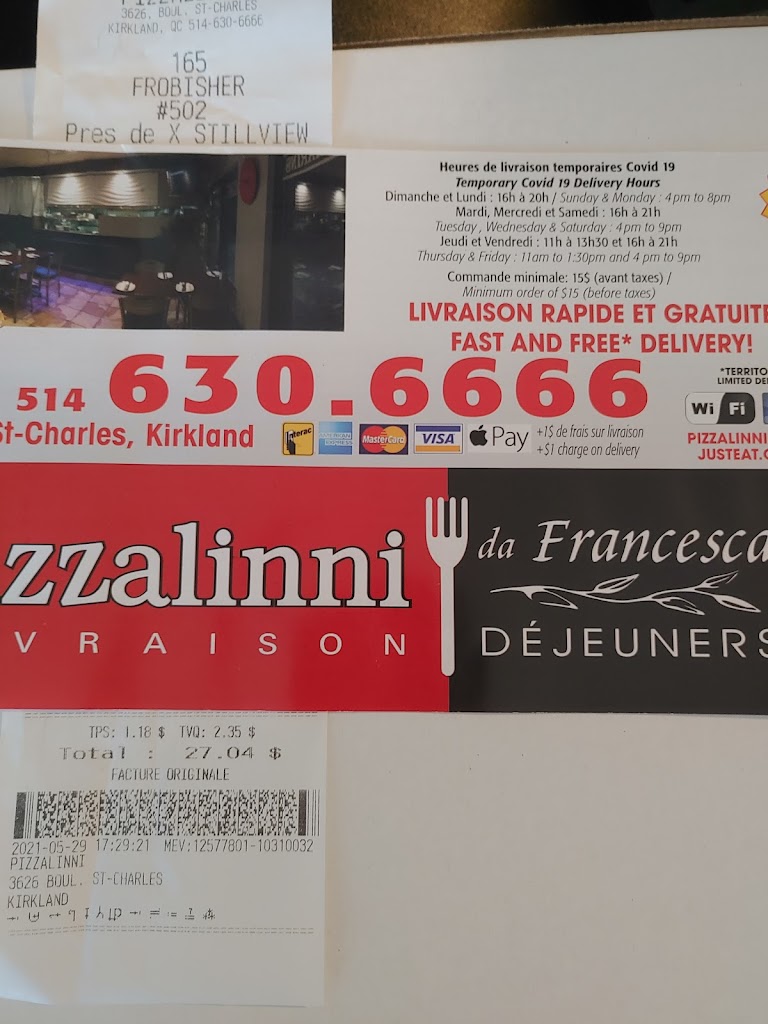 PIZZALINNI De Francesca 3626 Saint-Charles Blvd, Kirkland, Quebec H9H 3C3 In Galeries de Kirkland Corner of Brunswick and St Charles You will want to find this Kirkland restaurant....it is right next to Gourmet Privledge Dine in, Take Out, Delivery with taliup Wonderful staff Real pros in the hospitality business We were treated to a nice warm bowl of homemade soup!! I chose cream of mushrooms.... yummy.... I ordered the 25th anniversary pizza It was quite the celebration on my taste buds Spicy homemade Italian sausage, bacon, onions, mushrooms, pepperoni, parmesan cheese, sauce, on a thin crispy hand tossed crust Frank, the owner, is very proud of his staff...these homemade meals came out hot and fresh and made with love.... I enjoyed every bite..... Along with complimentary soup, we also were treated to a red velvet cake dessert on the house!! Now, my grandfather always said, you can tell a good restaurant by their coffee....I was served amazing coffee to go with my dessert.... Ahhh I brought half my pizza home in a box to enjoy tomorrow.... I got home in time to watch the Raptors out play Philly....but if you want your PIZZALINNI delivered to you so you dont miss a basket....contact George and Areez and the Taliup team.... You will be glad you did... As you can see from my bills one before and after the WIFG discount you will get your moneys worth for sure!!! My dinner Tonight was only $17 Plus a well deserved tip! Cook and clean up the kitchen? Why bother? Treat yourself and your friends Vegetarian options: I do not know about dietary restrictions....I did not have reason to inquire Wheelchair accessibility: Flat parking lot to sidewalk to inside restaurant....wheelchair can pull up to the table...bathroom large for wheelchair access....handrail next to the toilet, however the toilet is low.....should be comfort height....wash basin accessible....