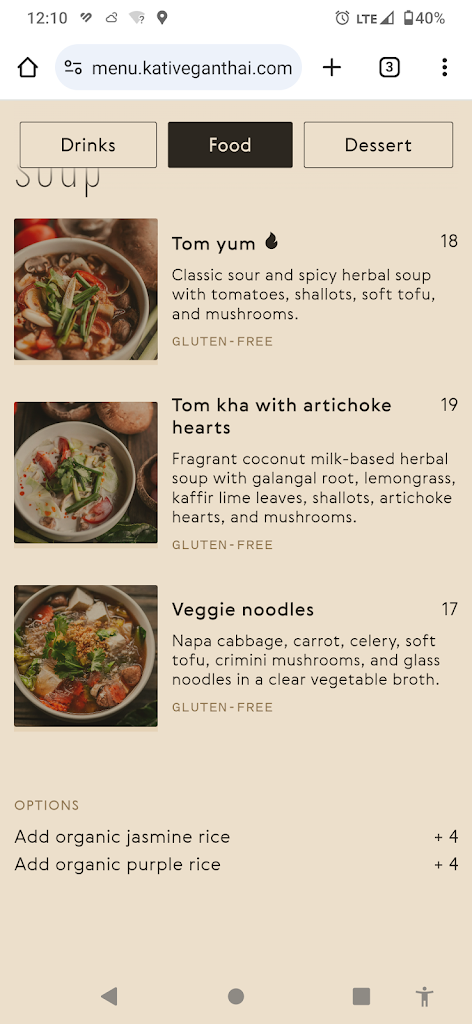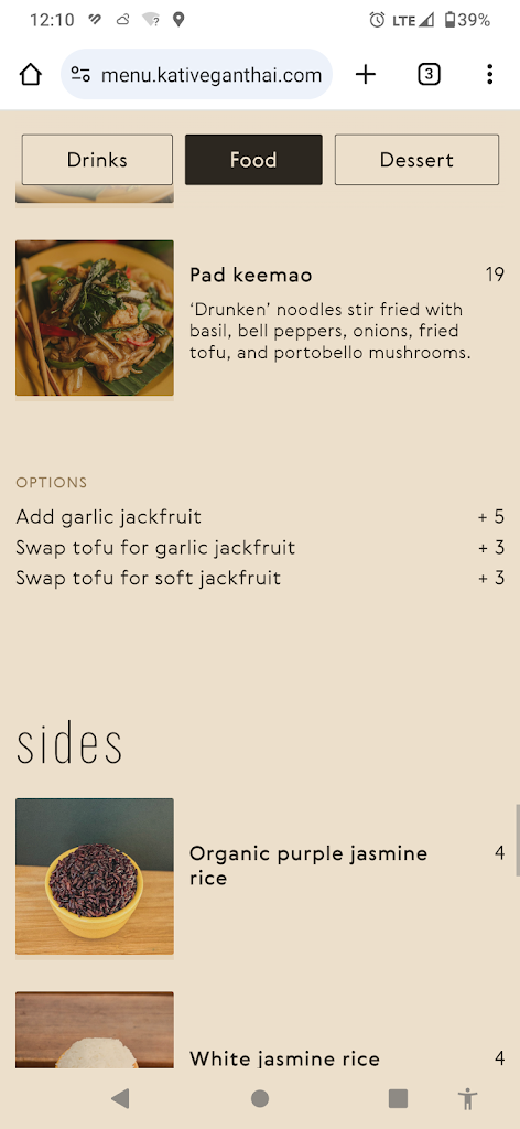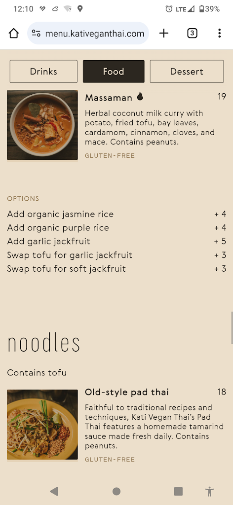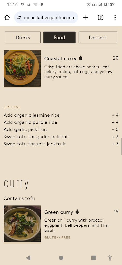 Kati SLU is very close to my heart. Be it happy or sad, I felt so comfortable getting food from Kati SLU. It was also one of the first restaurants I had eaten from when I was new to the greater Seattle area. There are a bunch of items I frequently buy from Kati, and Kra Pao is one among them. This was my first time ordering from Kirkland. I got the Kra Pao to simply celebrate my birthday in solitude. I was slightly disappointed. It nowhere tasted close to what I get from SLU. It was more watery with bigger chunks of the plant meat. Vegetarian options: As the name of the restaurant indicates, menu is all vegan. Love the coconut milk in the curries and everything.