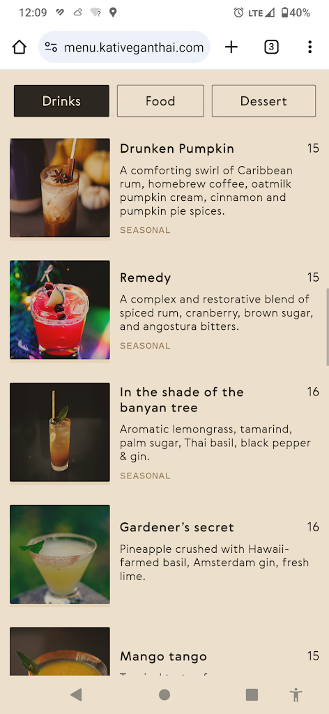 I go here with all my vegan family members or friends when theyre in town. Everyone weve brought (even non vegans) have enjoyed the food. The khao soi is my go-to dish, so Ive had a hard time branching out when I know the dish is pretty solid. Other people in our party had 2 of the fried rices-which they ate up and massaman curry-very good as well. Phad keemow was a hit, too. Their cocktails are soooo good and very well made. The gardners secret is my favorite, but the gimlet, blood orange margarita, mango drink, and mai tais are delish as well. I was a little disappointed in the Thairish Tea, but it wasnt bad, but probably my least favorite of the drinks weve tried so far. The service isnt always super attentive to ask for your drink order or check in, but they are super fast delivering the food.