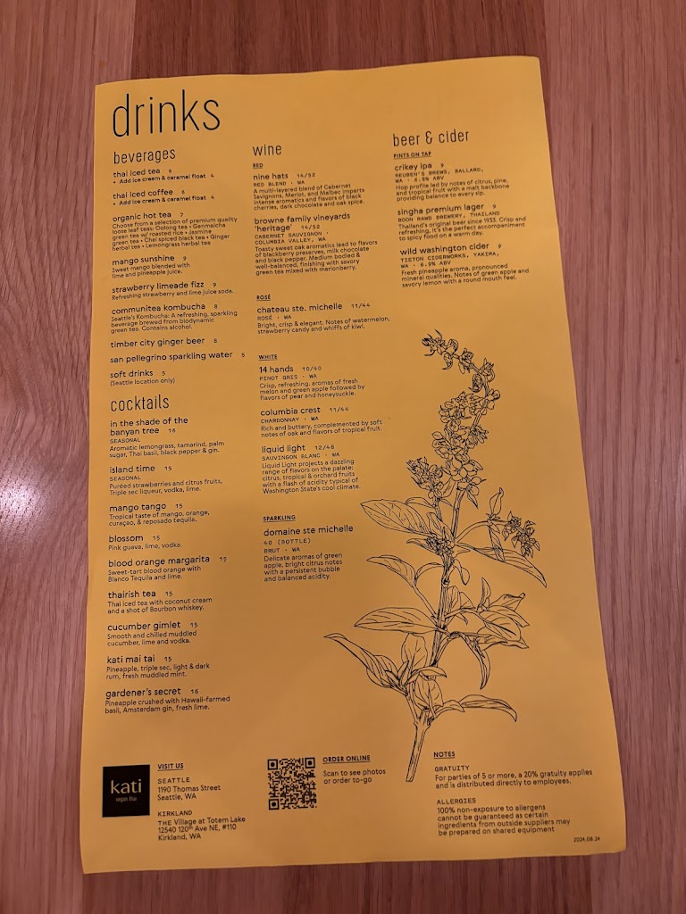 We went to a fairly new Kati vegan Thai in Kirkland, WA. Its nice atmosphere. Its a classic vegan Thai restaurant you should definitely try when u come to seattle Kitchen closes at 8:30 pm so be prepared to come early a bit. Lot of people came and left since the kitchen was closed. Vegetarian options: Its a Vegan Thai place. Super famous in Seattle area