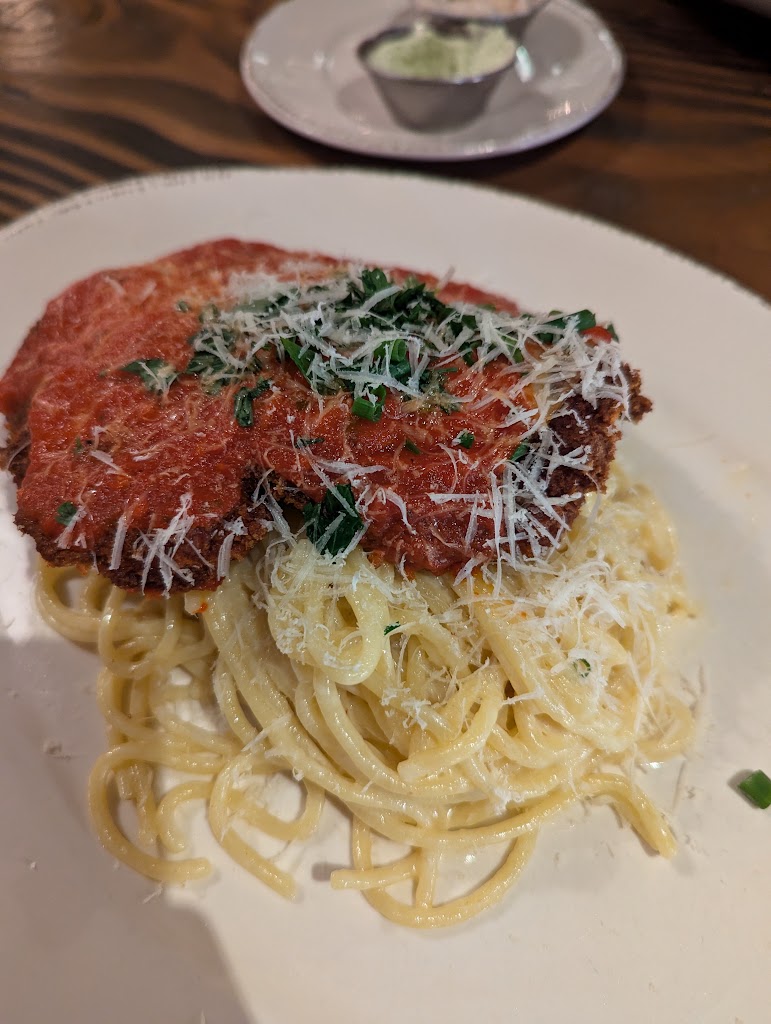 Apps were great , service was great, just a little slow . Main course chicken parm, which is supposed to be one of their specialty dishes , underside of chicken wasn t just overdone , it was completely black . They offered to remake it but I wasn t interested , the meal was ruined, appetite gone . Nowhere near as good as it used to be here , will likely not be returning