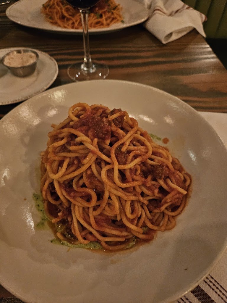 Great atmosphere, staff were all very friendly, food came within a good period of time. I was expecting some really amazing handmade pasta and pizza, but to be honest, neither myself, nor anyone in my group, felt it was any more special or delicious than a pasta dish you could order from literally anywhere. Underwhelming pizza as well. Pricepoint is I guess these days typical for eating out, but with 4 meals and 2 alcoholic drinks, about $150 + tip sadly. Had some very unique pieces on the menu, but could use more delicious Italian classica that arent so fancied up. Vegetarian options: Didnt have a ton of vegetarian options that I liked. Fake chicken was horrible