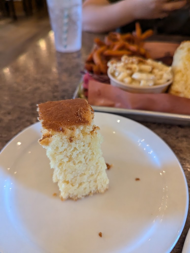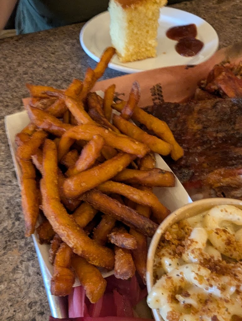 One of the best local restaurants, its a southern American restaurant, so they serve gumbo (and its really delicious and filling!) Ribs and brisket are of course, and the cornbread is seasoned just right and delicious. Theres so much of it that I have to pack it, but I order extra cornbread, freeze it at home, and eat it for breakfast sometimes. Coleslaw is also delicious. Its just delicious overall. (All the sides seem delicious!!) There are so many French fries and sweet potato fries that its easy to end up with leftovers, so choose wisely.
