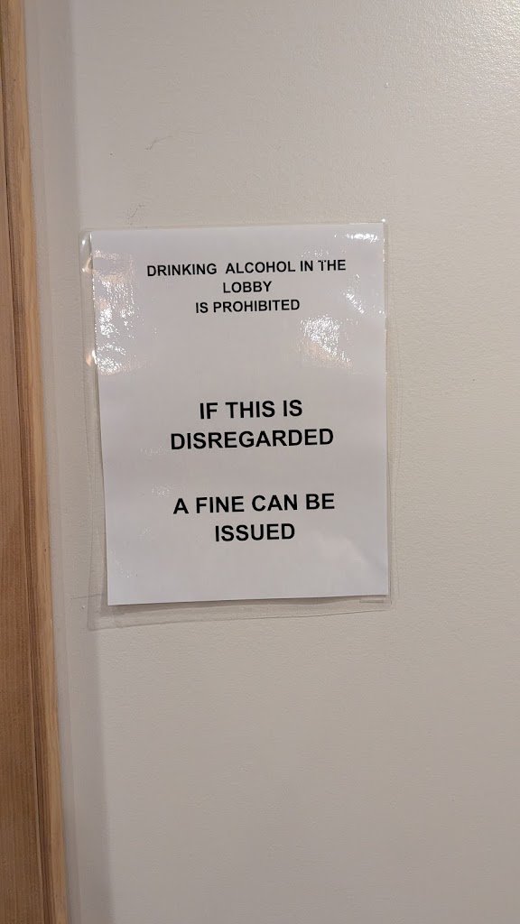 Fyi this is a very noisy location on the corner of what seems like the busiest intersection in town, next to the liquor store and the Tim Hortons guaranteeing late night and early morning traffic outside your windows. Do you like awaking to natural light like me? Well no such luck here as there are 5 bright street lights shining in your windows all night so it's bright as high noon all night. It's very disorienting because the bright light shines all around the curtains so you can't tell if it's day or night. On a more personal note, my husband and I attempted to enjoy a glass of wine during sunset in the unoccupied area of the hotel property patio. This part of the patio is fenced off from the other patio areas, is obviously unused and covered in cobwebs, so imagine our surprise when Julie from Riverside Inn Pub harassed us about breaking your unwritten rules regarding alcohol consumption and ordered us to dump our wine out, and then had the nerve to advise that we purchase new drinks from your bar. The only listed rule states no drinking alcohol in the lobby, (picture of Riverside's own sign included) but Julie repeatedly insisted no open containers were allowed thru the lobby or on the patio, except what was bought from her and acted like we should have known that. She repeatedly insisted that we dump our own wine and buy more from her bar, and that these rules were listed (they are not) and are in accordance with the local law (how many travelers you all see thru your hotel that are aware of all the local laws?). Overall horrible experience, rude staff, loud location, difficult to sleep with the noise and light issues, topped off with an emergency vehicle driving by with full sirens at 6am.