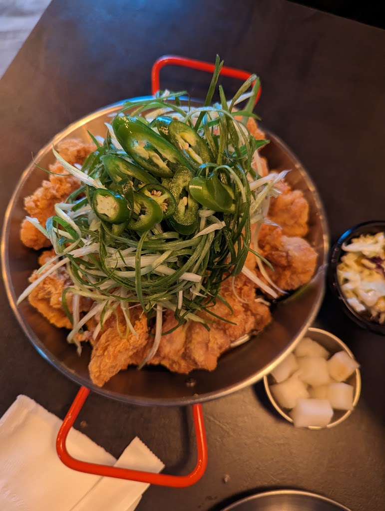 Our group of 4 came in at 8PM and the restaurant was half full with one longer table in the middle reserved and one occupied by staff eating their dinner. When we said table for 4, the server asked if we had reservations then looked at her watch as if the place was closing. She sat us begrudgingly so it was kind of off putting. Ordered the golden fries and two orders of chicken (that come with daikon) and rice. Fries had a nice seasoning to them. The soy garlic was light in flavour and I wish it packed more of a punch because it seemed like we had just ordered the original flavour. The soonsal was nicely flavoured with a good tinge of spice. A bit pricy for Korean chicken ($27) as there are other establishments that offer more for less cost. Regardless of the service, we were all fed and full but I don’t know if I would rush back.