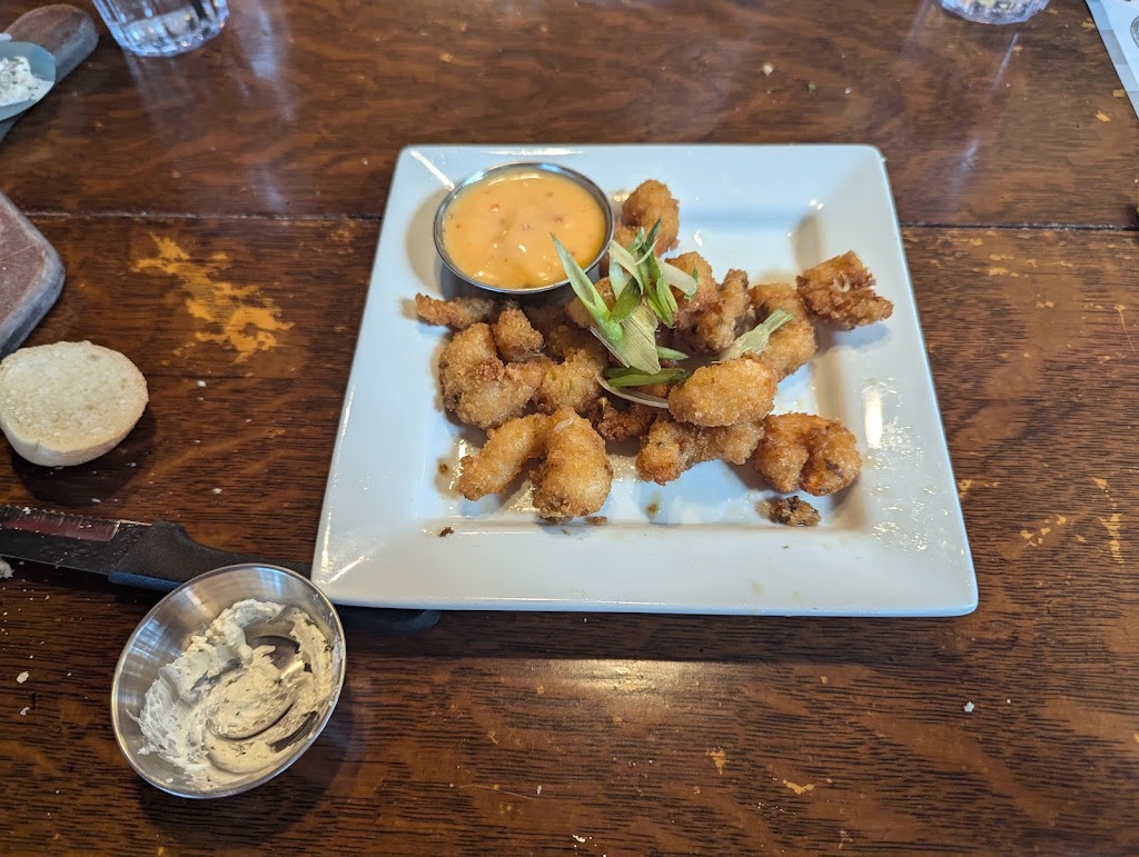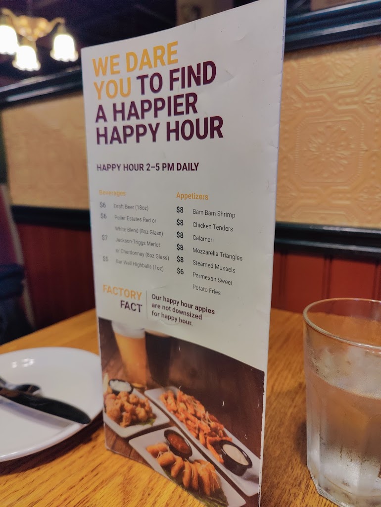 Greatly enjoyed our visit today. Came in time for happy hour! They maintain their regular portions but have reduced prices. We had two children with us and two adults. Ordered almost every item on the happy hour menu plus two kids meals. Enjoyed calamari, steamed mussels, bam bam shrimp, yam fries, and mozzarella triangles. All tasted amazing! Super filling. Adults and kids filled up on just those and now we're taking home their kids main entrees and leftovers from the appies too! Service was fantastic and it was nice and quiet for the bulk of our meal. Would absolutely be back!