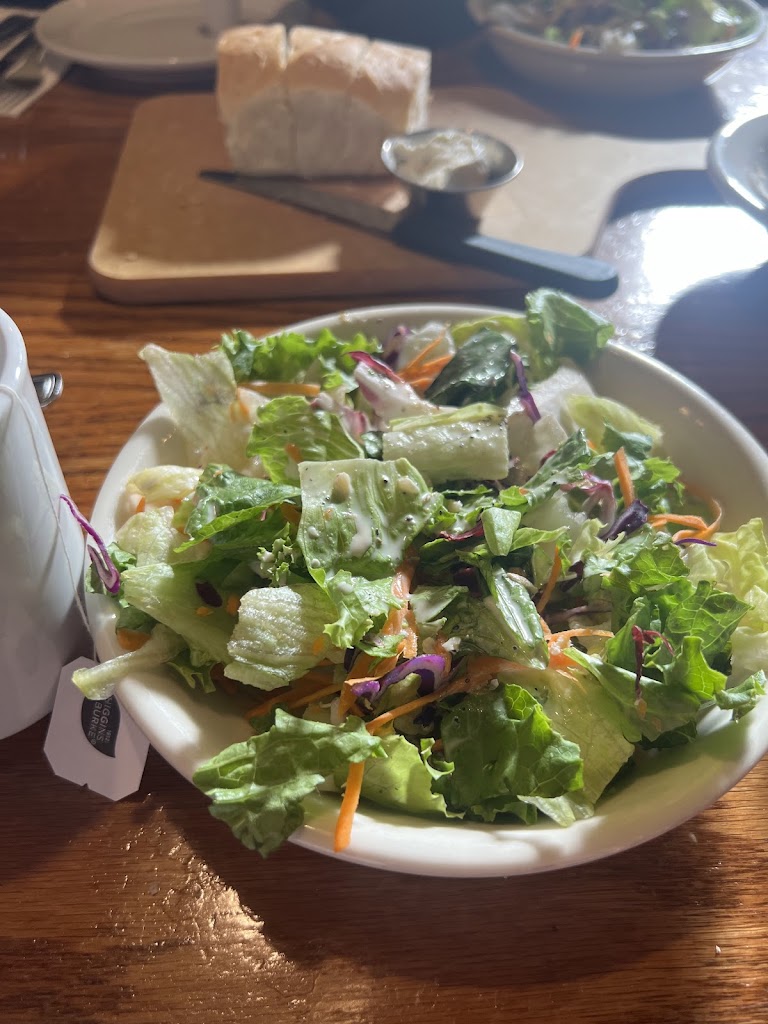Green salad could be served with fresher ingredients rather than just generic. Upgraded to caesar salad wich was a lot better. Ordered white wine, as the red wine tasted fizzy like if it had been sitting too long in an opened bottle. Ribs were tasty. Service was very good. Ambience was nice. Value is good overall.
