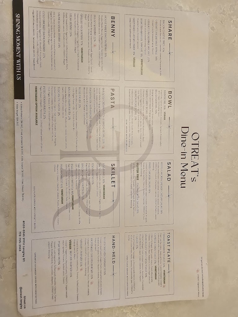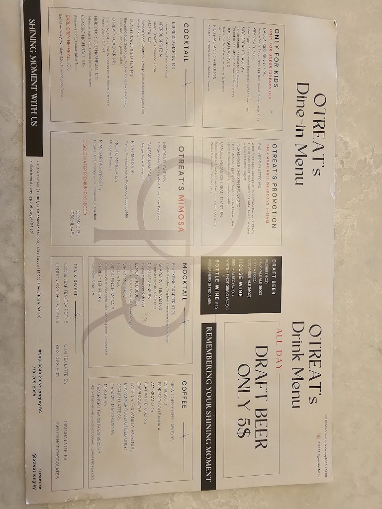[July 2024 Update]: Recently revisted Otreat in Walnut Grove, Langley and Im happy to report that their food got even better! I had the salmon benny on a pesto bagel and it was delicious! The bagel tasted homemade and the eggs were cooked perfectly. I like how you can choose your own bagel now. I also had the french toast. Its a must-try! Sweet, colorful, and all-around yummy. I highly recommend Otreat to anyone looking for a nice brunch. They can get busy on weekends, but it was worth the wait. Lots of nearby parking too. What a great restaurant option in the Walnut Grove area! -------------------- Creative brunch and dinner choices. Otreat does not disappoint. We loved the Korean fusion - anything with bulgogi, the sweet French toast, and pasta were all delicious. The mixed drinks were tasty and refreshing. What a great restaurant to take the family or hang out with friends. Ive also picked up a couple cakes at Otreat - the matcha cake and chocolate cake are wonderful - nice and light. Well definitely be back!