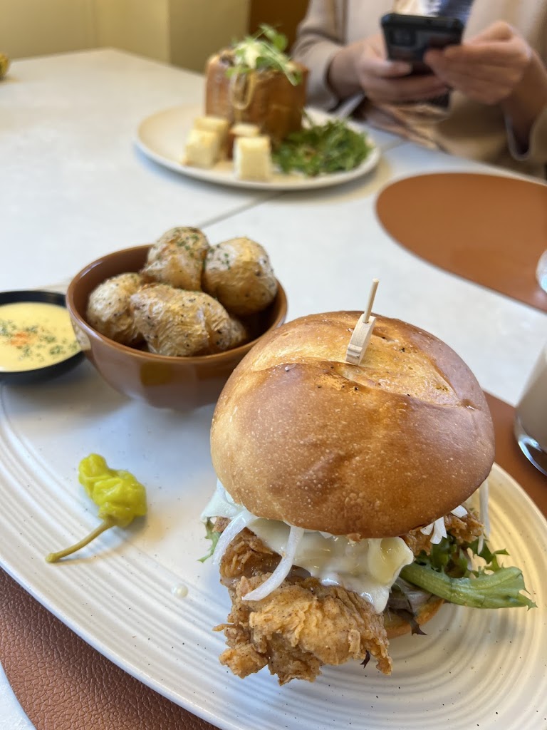 The first time I came here I had the fried chicken salad, the service was not the greatest and my salad came out way way after my friends dish and she was almost finished eating. So that was kind of disappointing. The salad was very good though and I would order again. Decided to come again with a different friend and my friend had the fried chicken benny but substituted the spicy hollandaise for regular and I had the crispy chicken burger. The bun was soft and the sauces were yummy! They were both delicious, I just wish there was an option to have salad instead of fries or potatoes as your side dish. We both also got dessert to go, the peanut butter filled croissant and an earl grey filled croissant. I also picked up an apple tart for my husband at home.